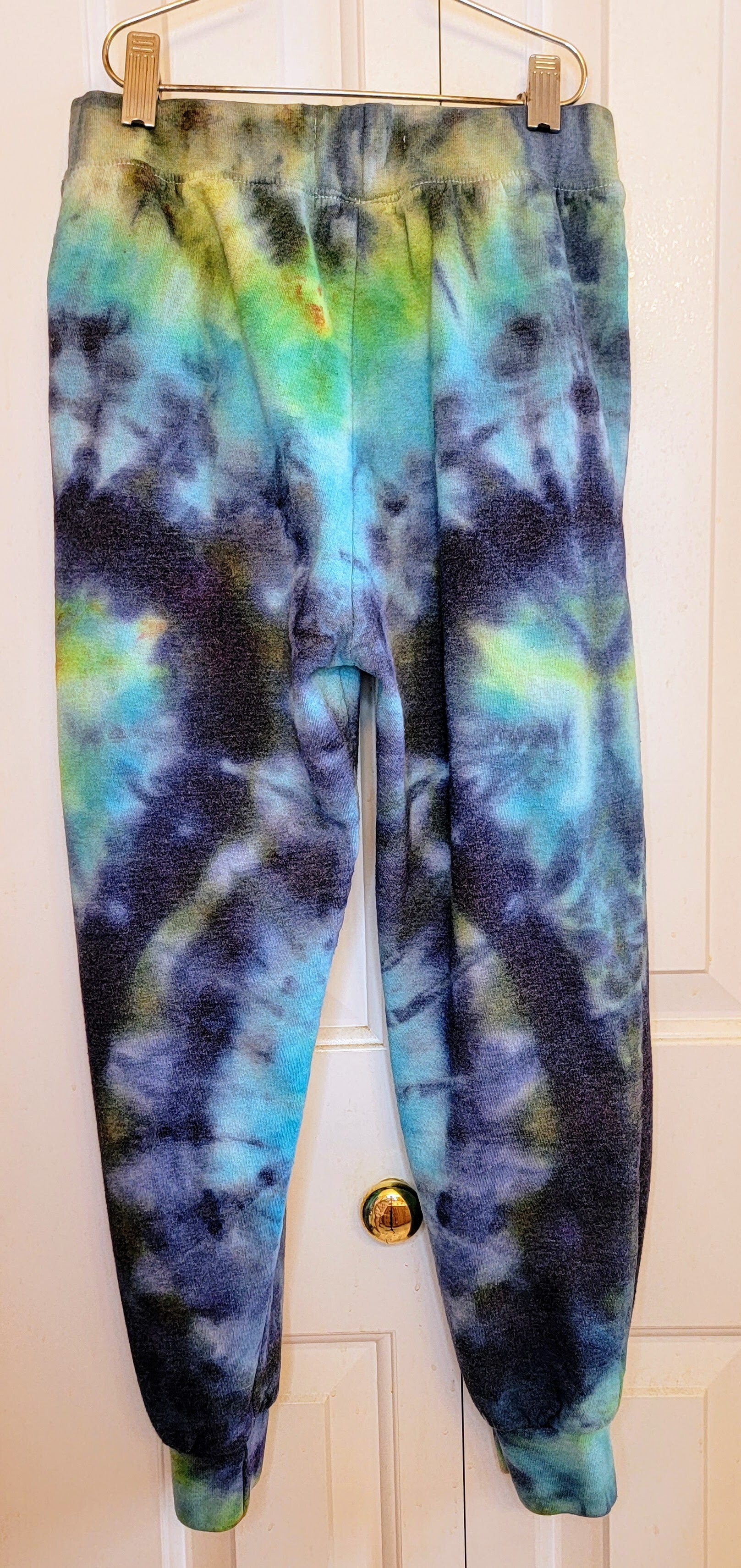 Steve's Jean's slim fit elastic waist band with draw string. Cuffed pants. Shades of blue and green