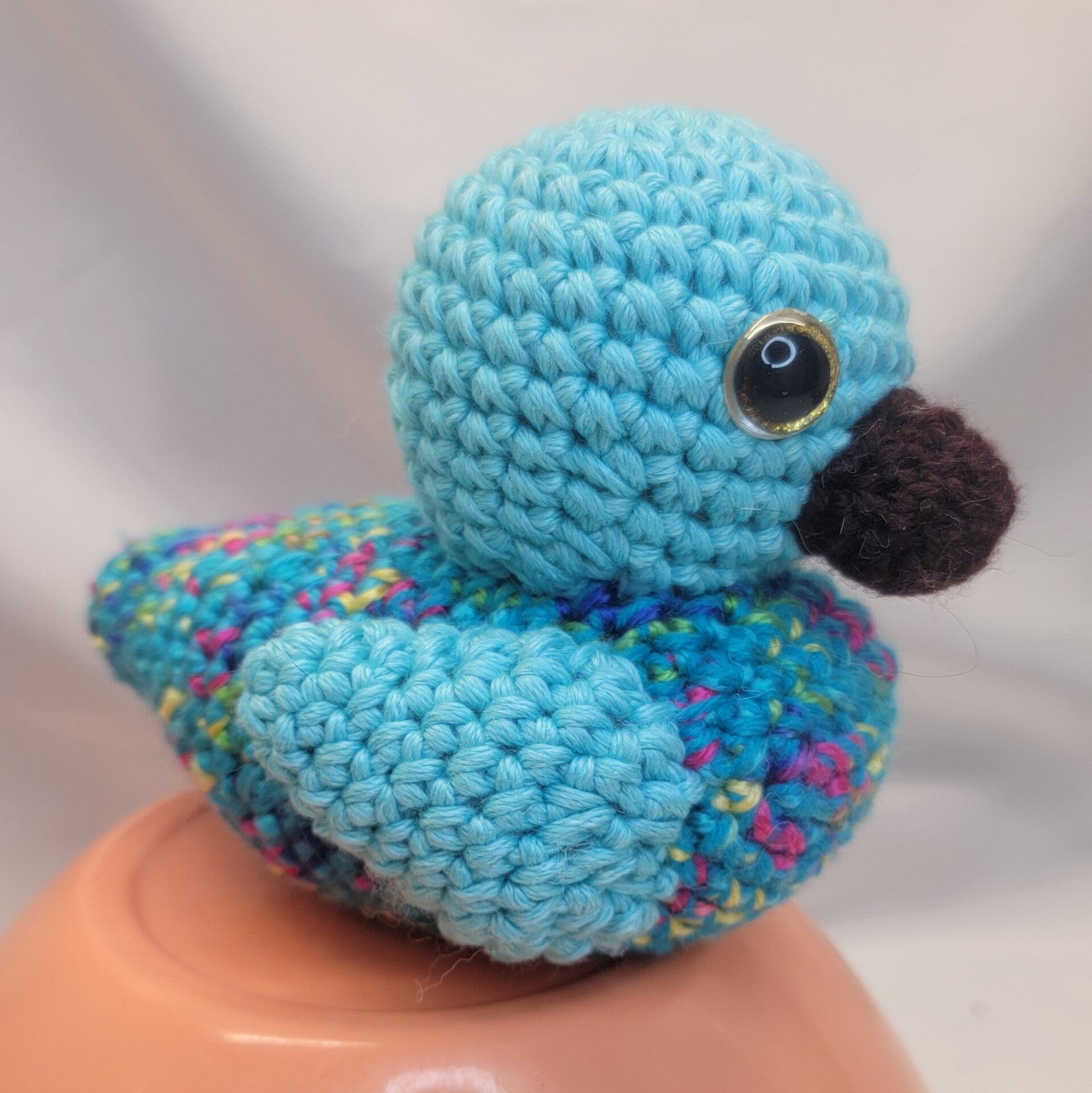 5" tall and 7" long turquoise duck with multicolored body and brown beak. Gold sparkly safety eyes.