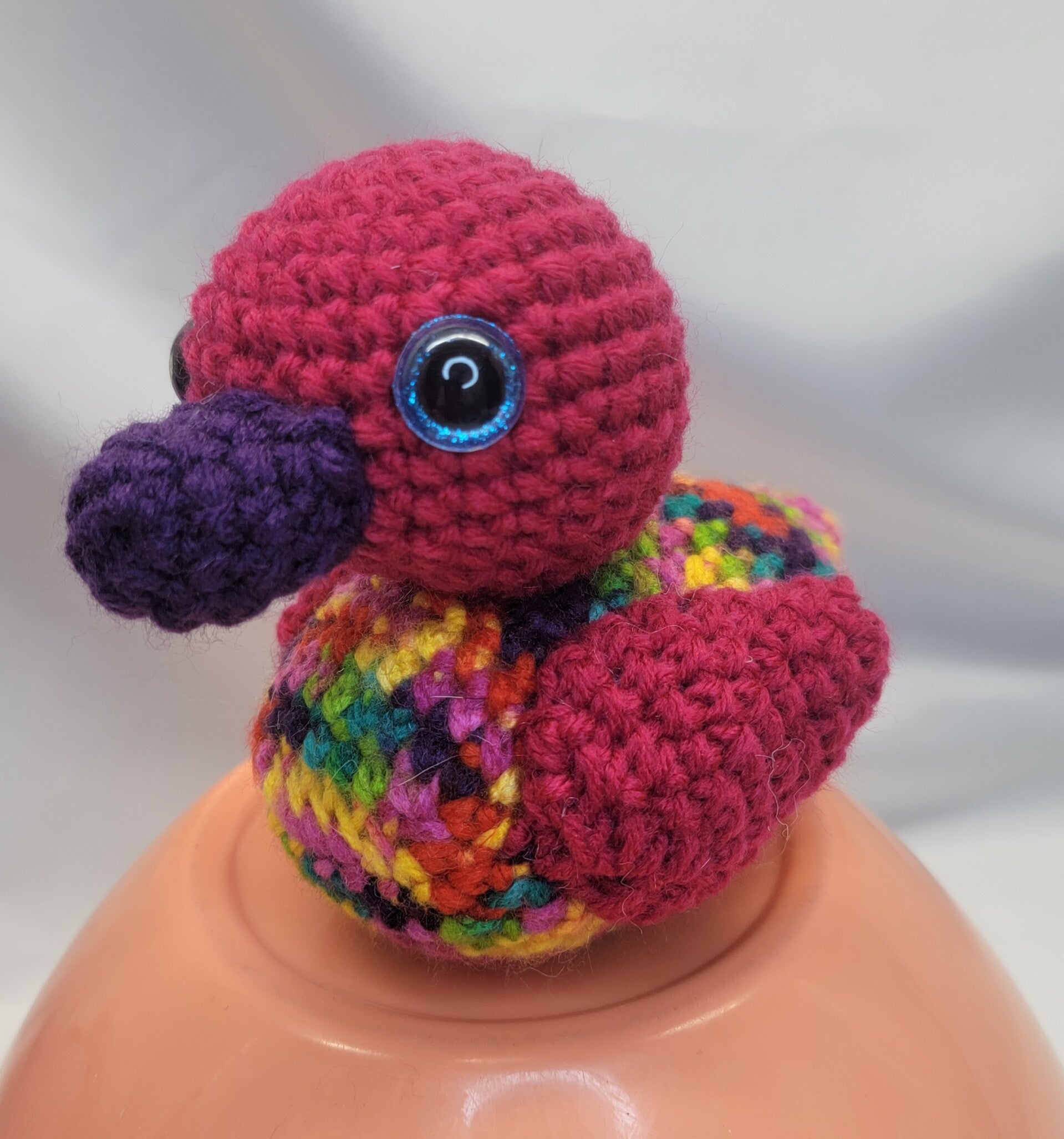6" x 6" long Fushia duck with purple beak and multicolored body. Blue sparkly safety eyes