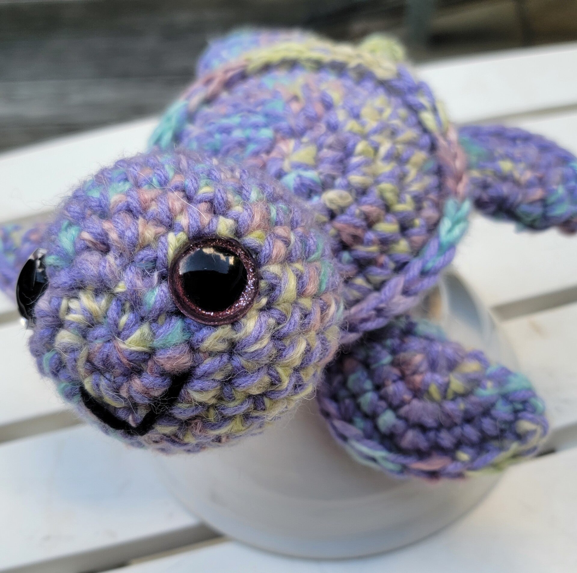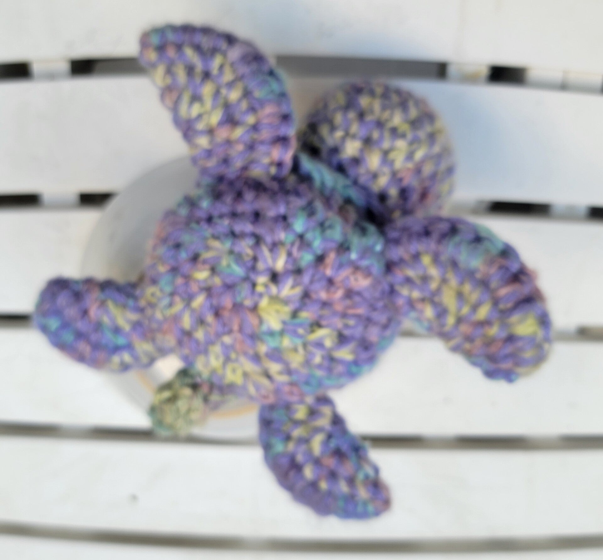 8" long and 8" wide pastel colors on this soft turtle. Pinks lilac yellow and green. Large pink sparkly safety eyes