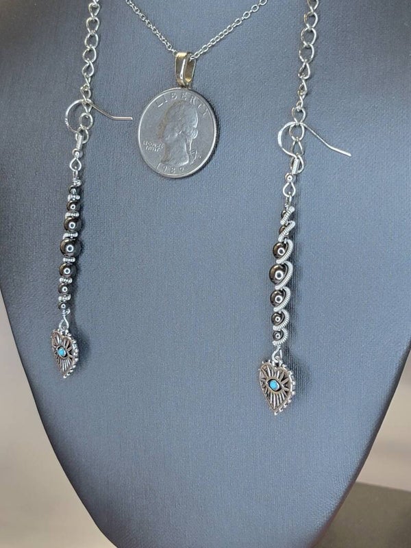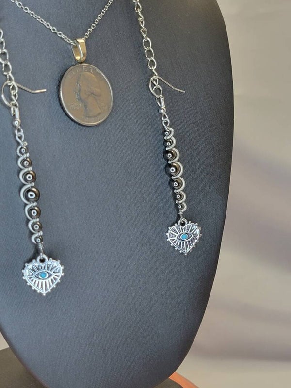 Earrings w/Black Beads & Wire Wrapped with Evil Eye charm