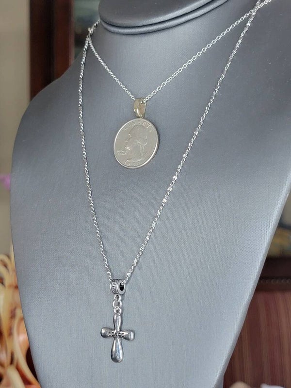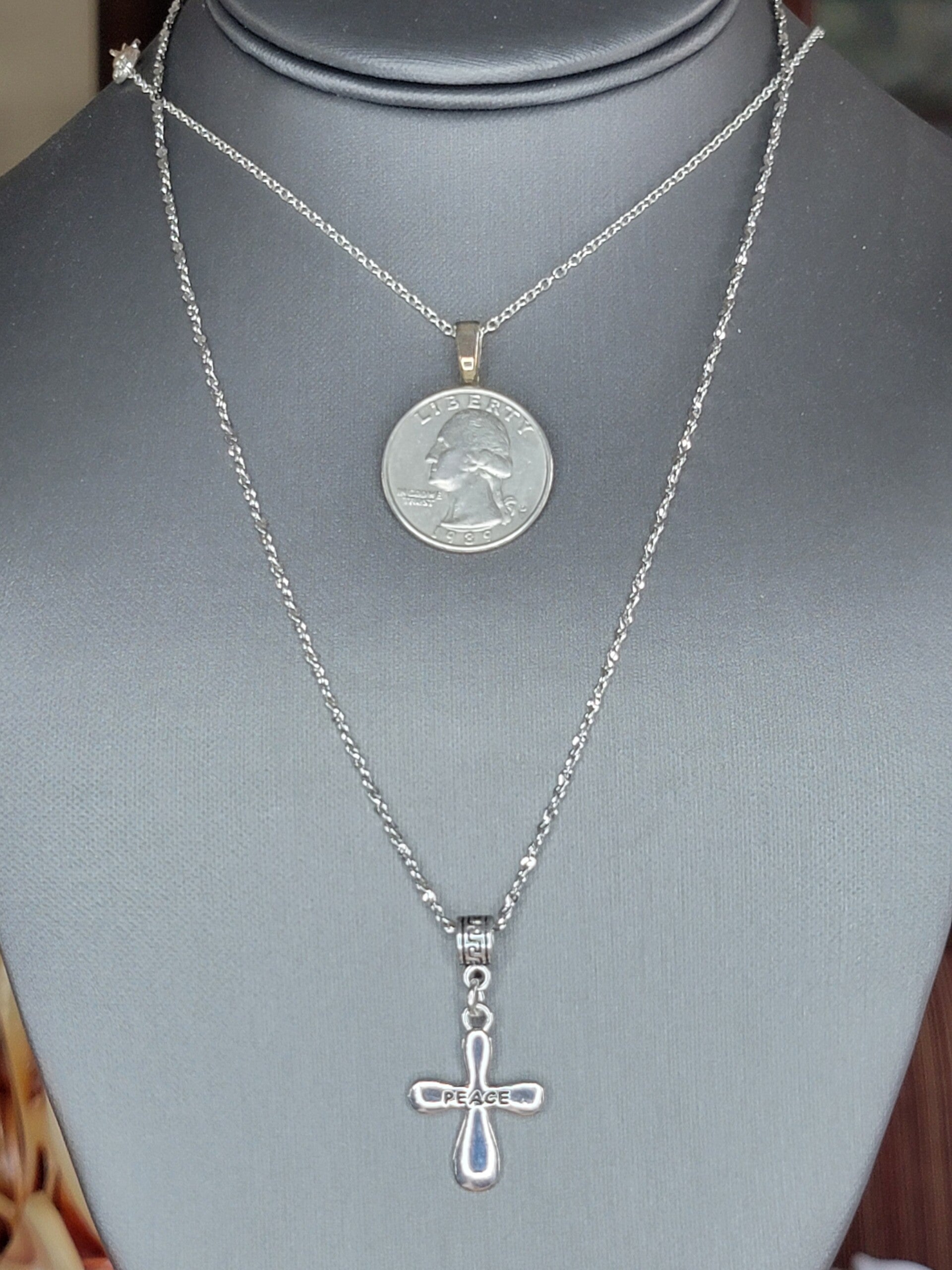 Handmade Necklace, 18" long, with Cross charm with the work PEACE
