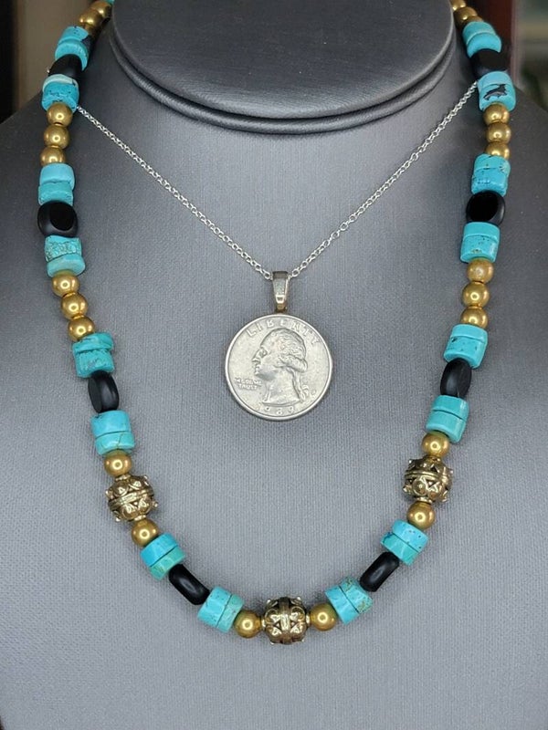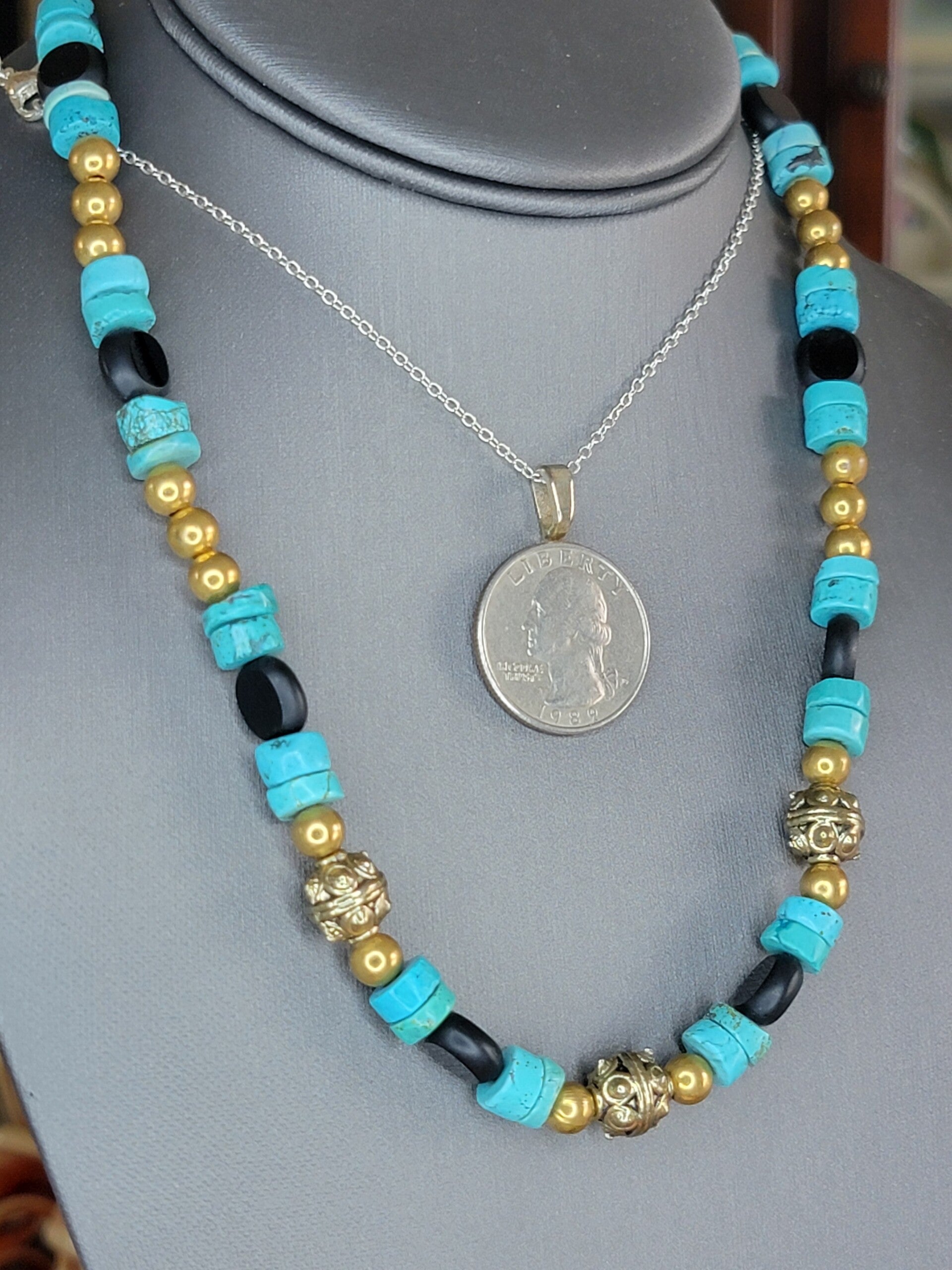 Handmade Necklace, 18" long, with Charms and Beads (Turquoise are not real)