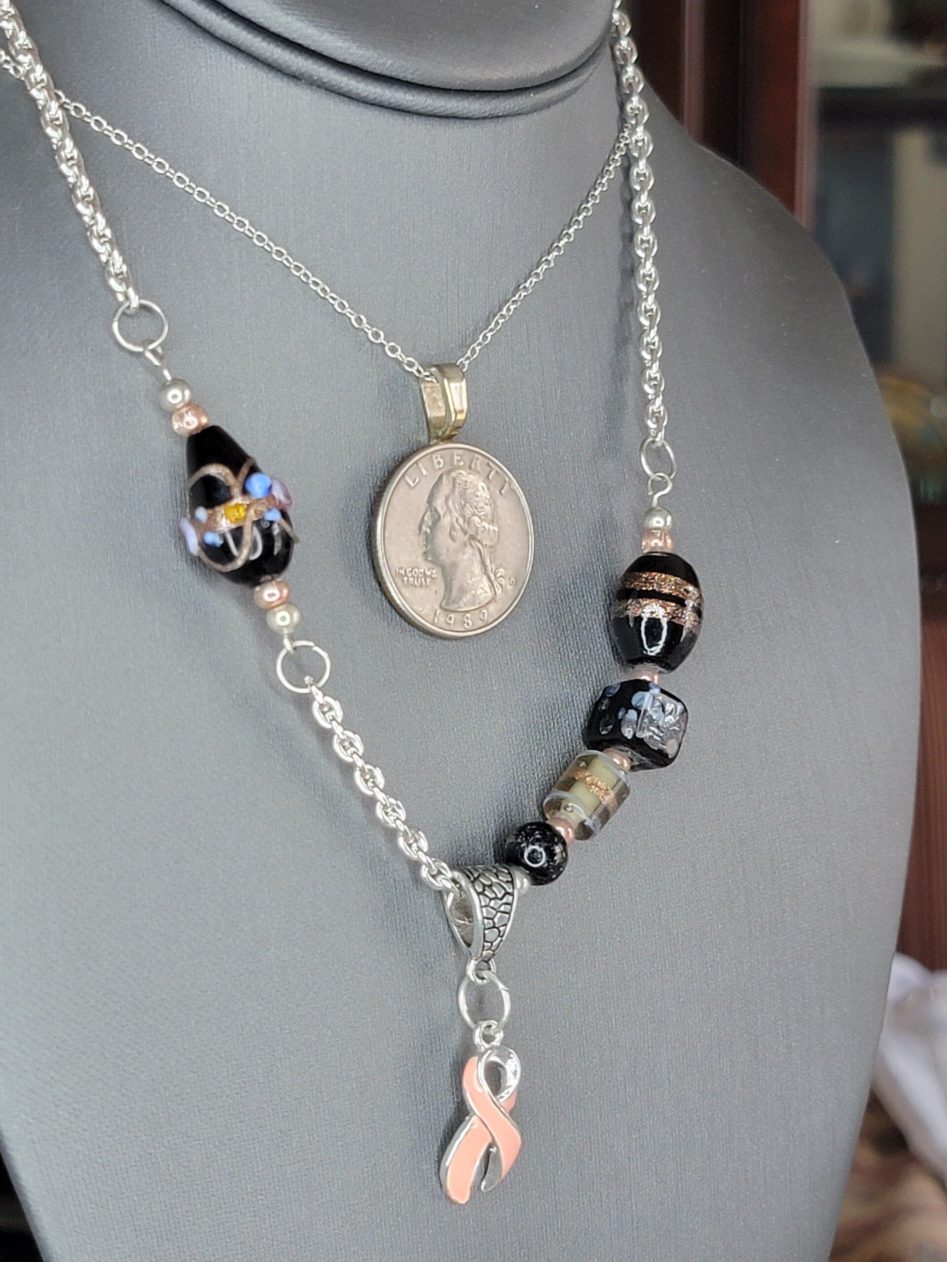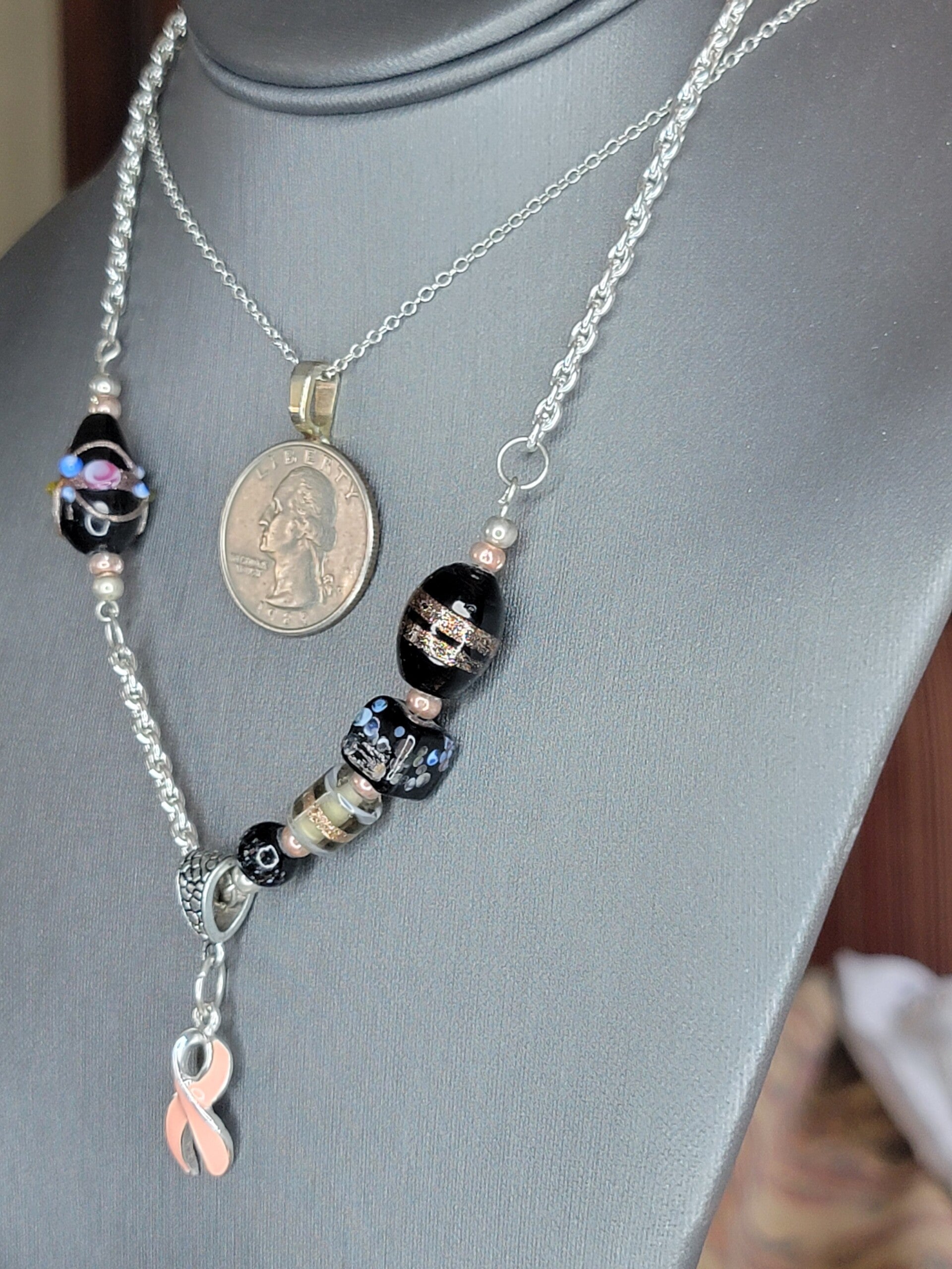 Handmade Necklace, 16" long, with Charms, Beads, and a Pink Breast Cancer Awareness Ribbon