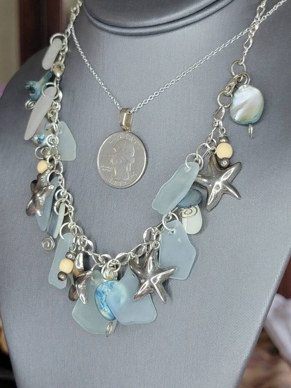 Handmade Necklace, 16" long, with Seaglass, Charms and Stones