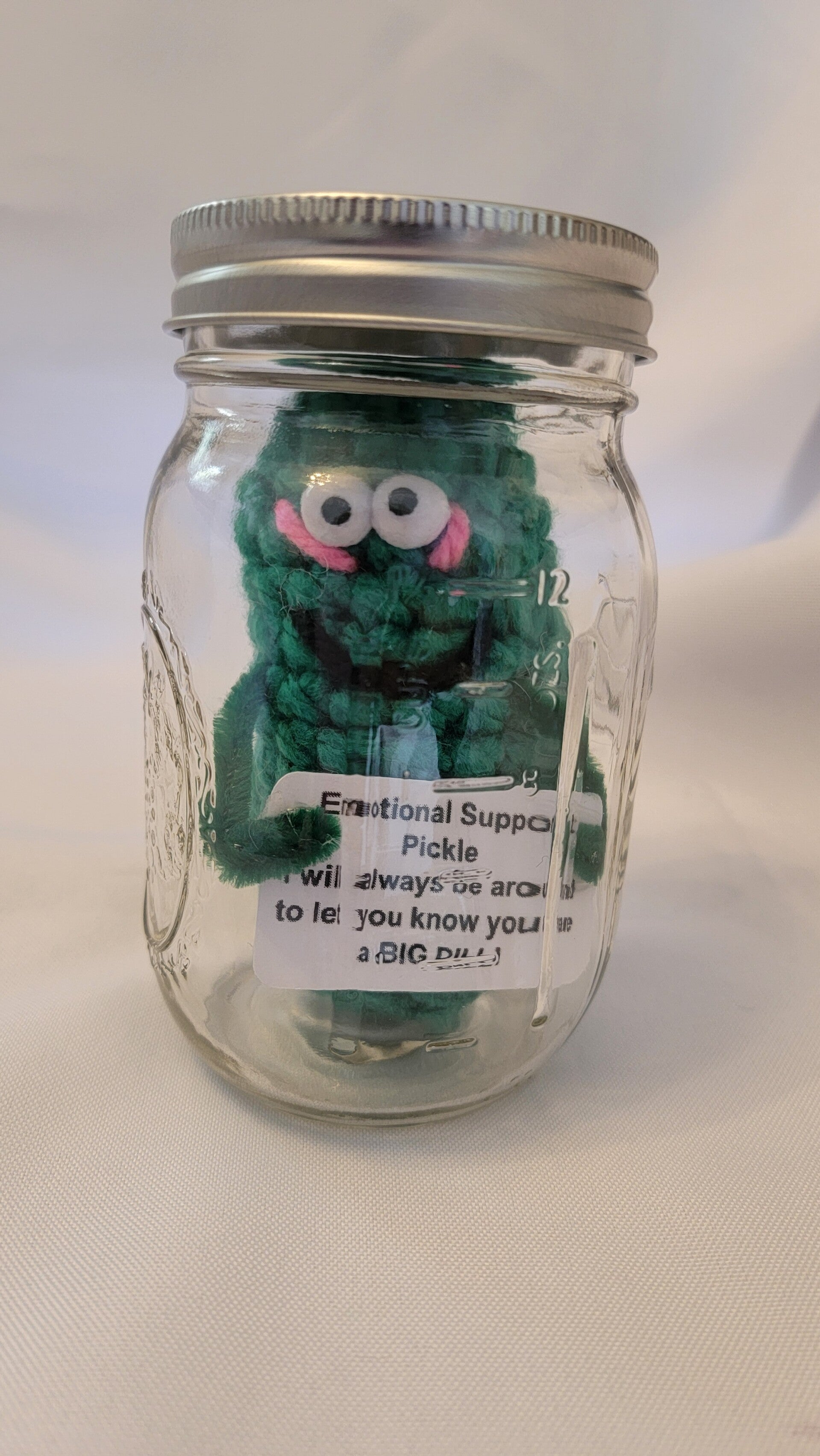 4" tall Emotional Support Pickle with google eyes and in a 1 pint Ball Glass Jar