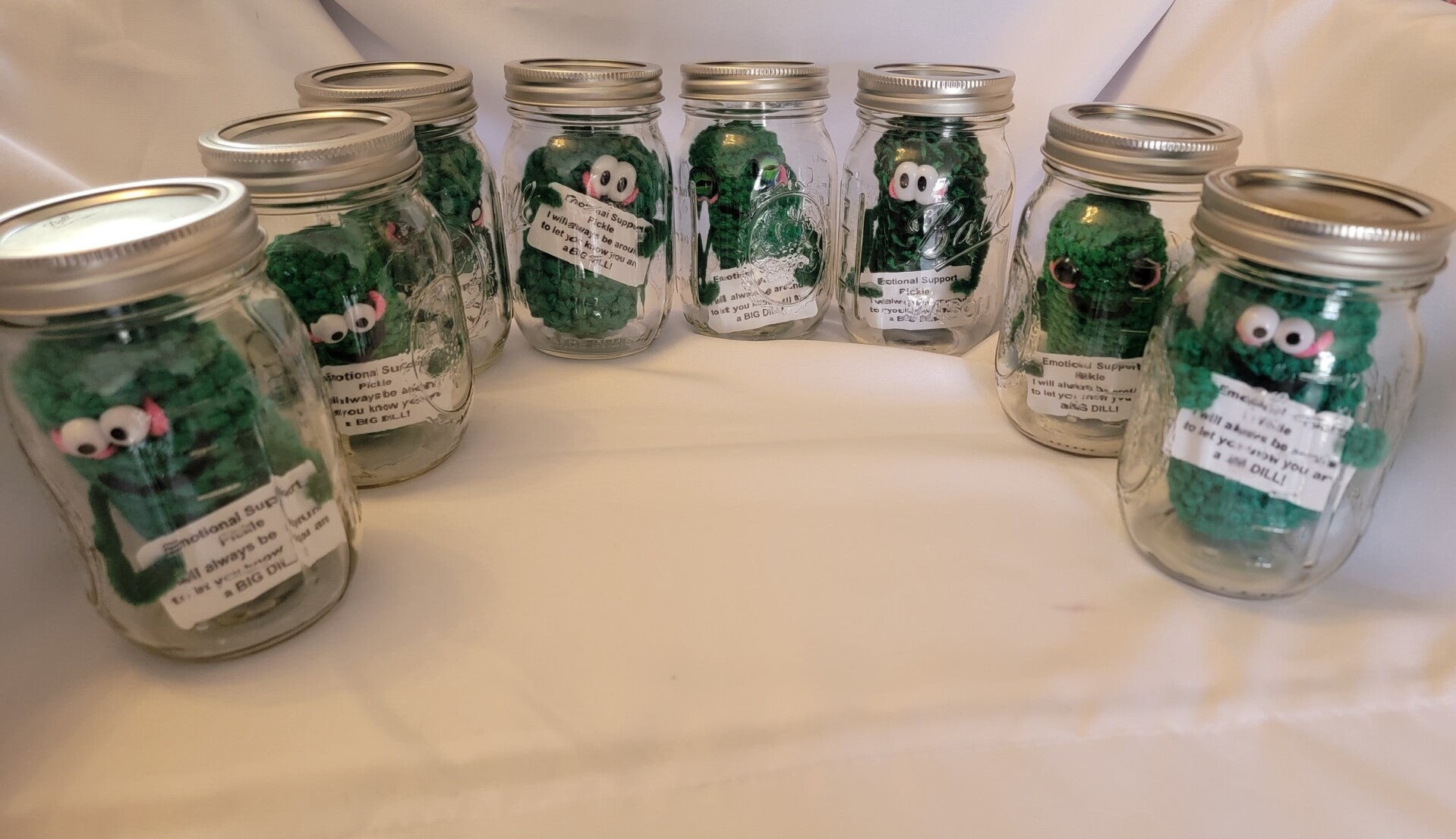 4" tall Emotional Support Pickle with green eyes and in a 1 pint Ball glass Jar