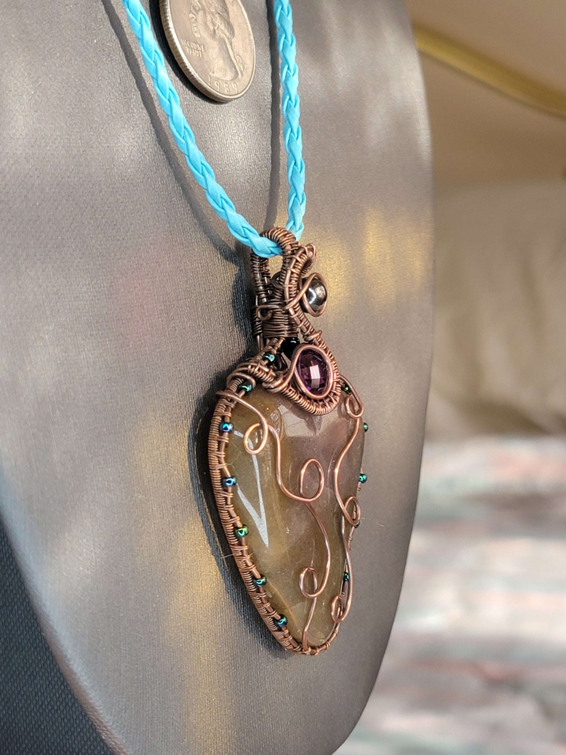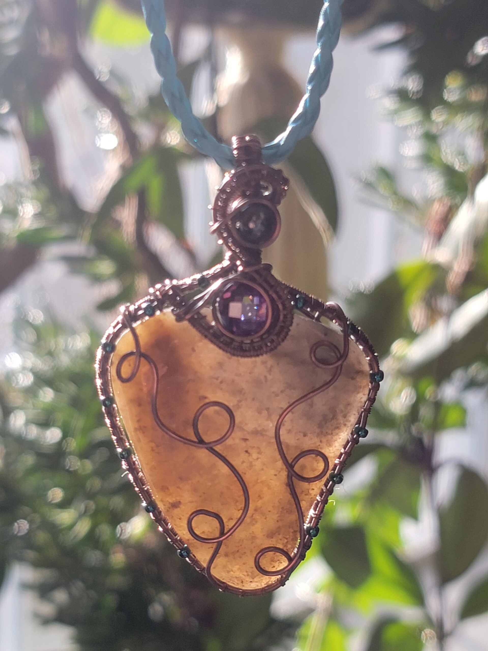 Handmade Pendant with Necklace, Chocolate Agate Cabochon, w/purple Zircon