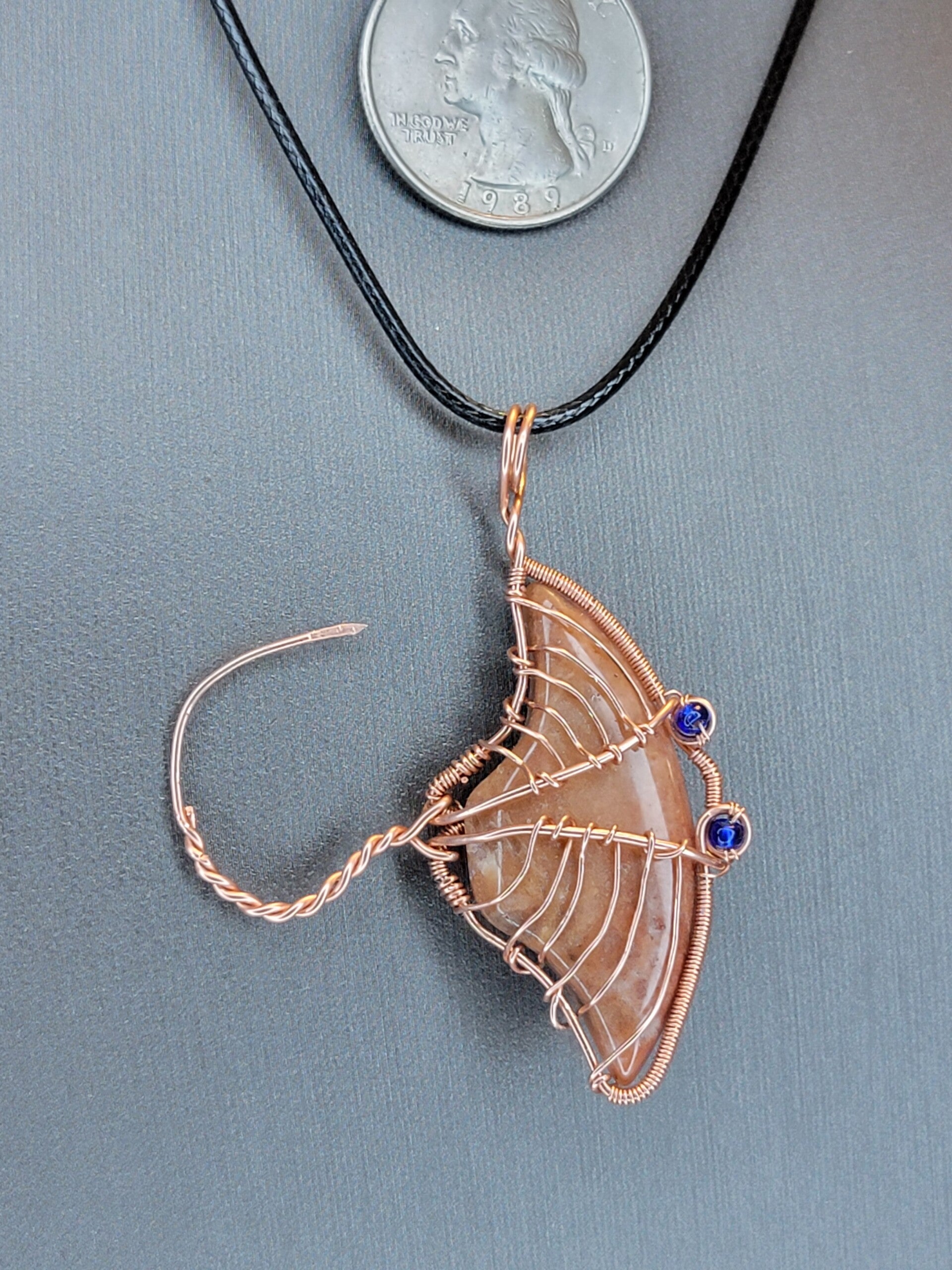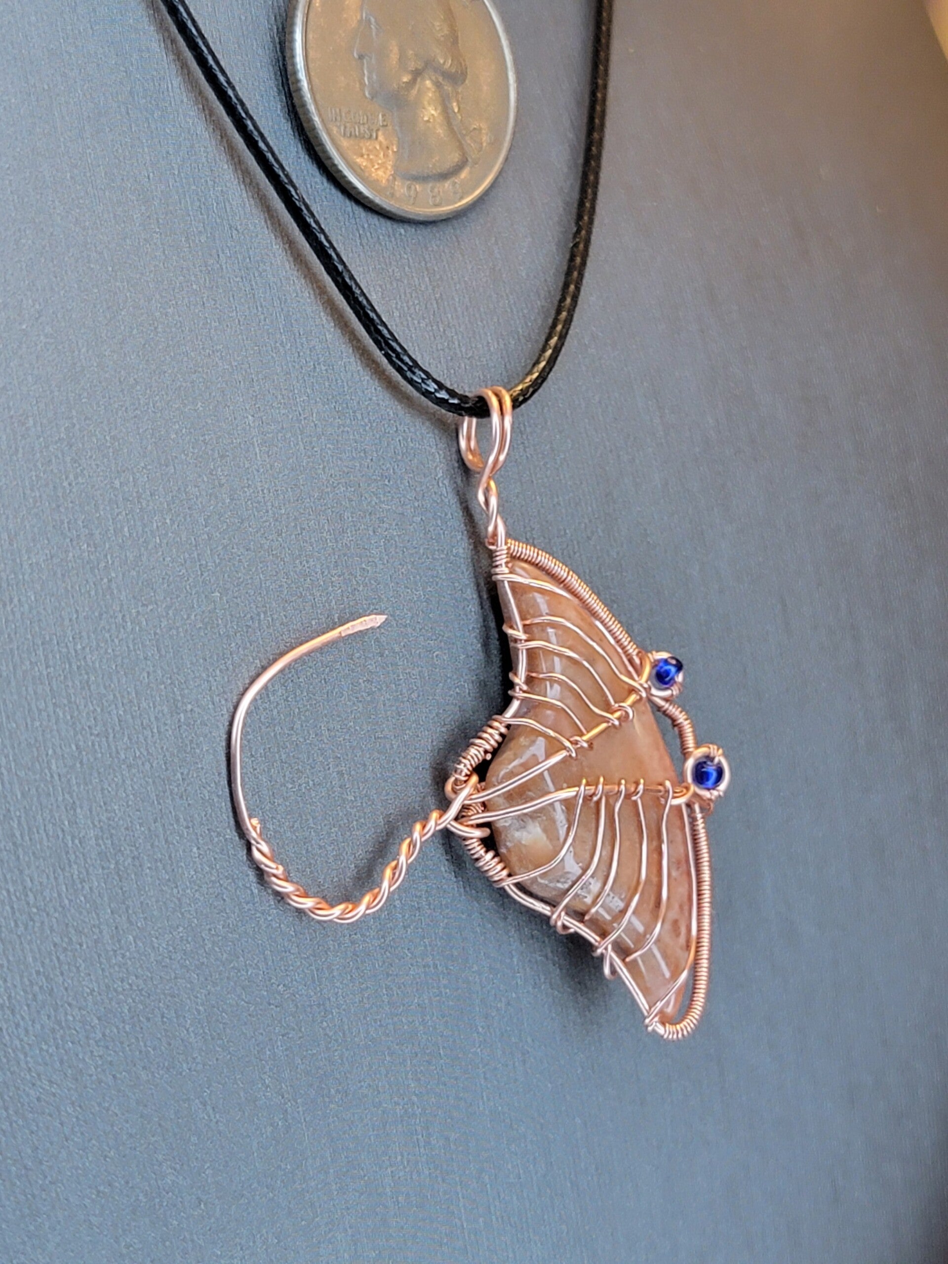 Pendant & Necklace, Stingray shaped Rhodonite Cabochon, wrapped in copper..