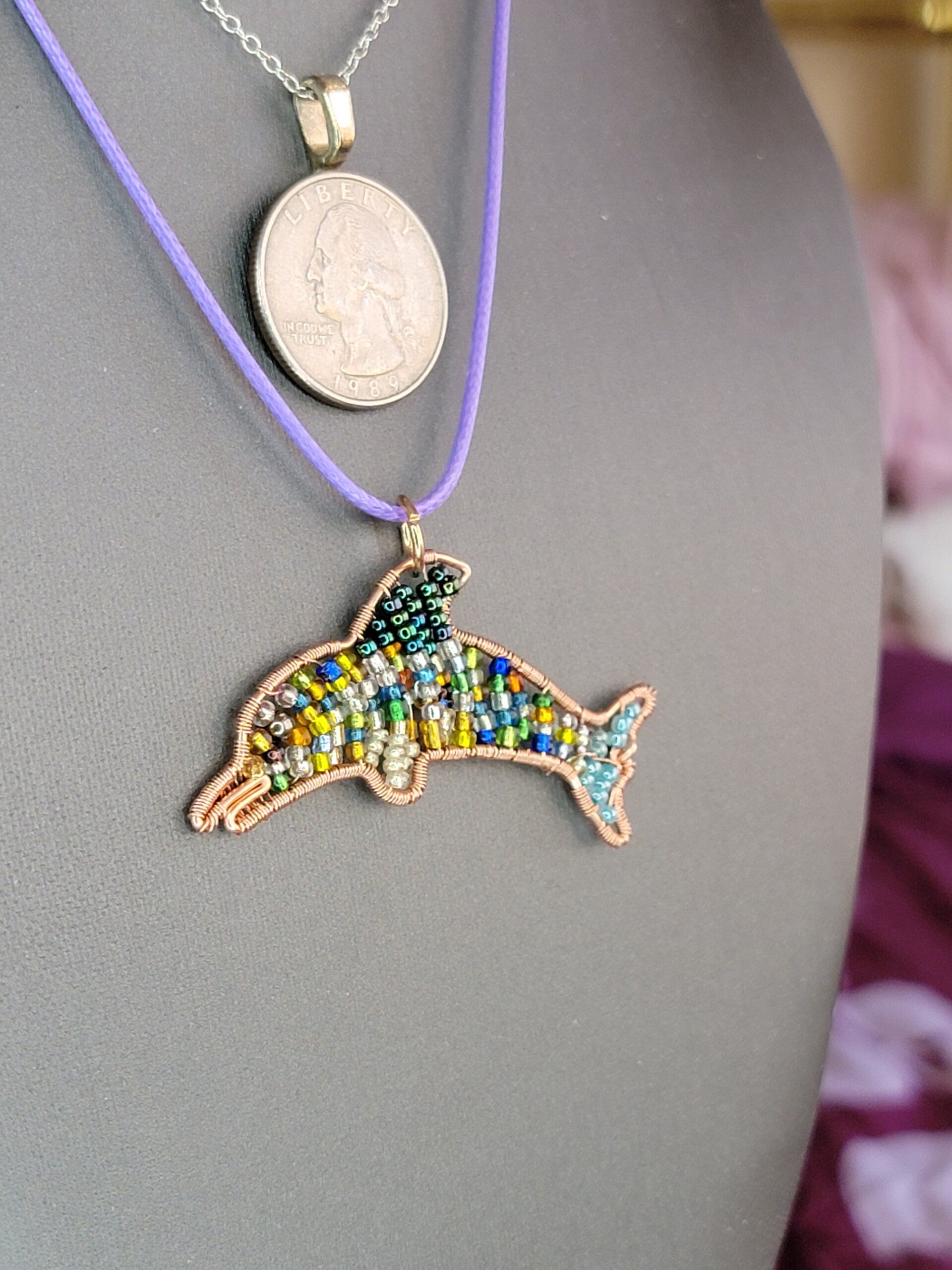 Pendant & Necklace, Dolphin w/zircon beads. Copper Wire Wrapped