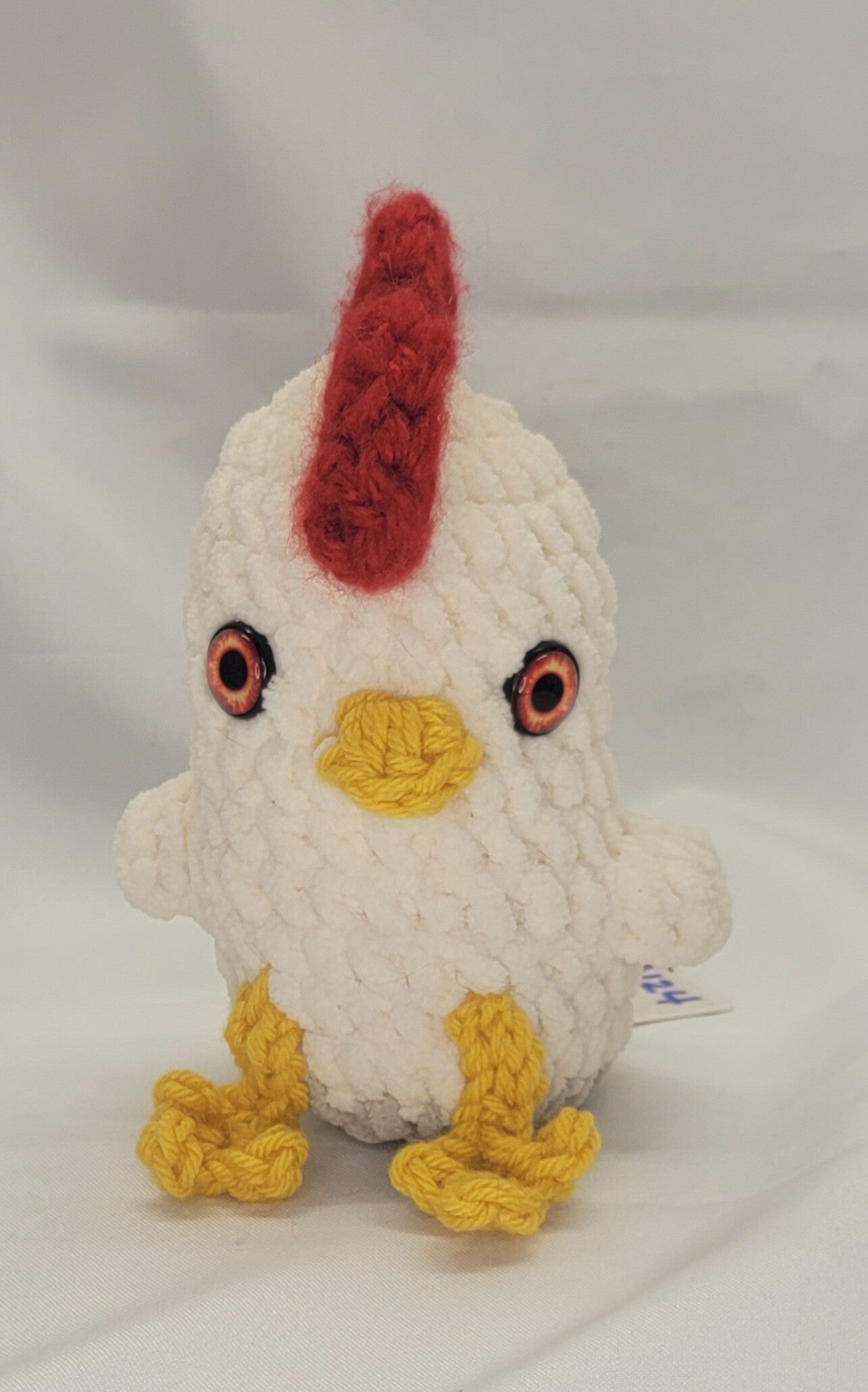 7.5" tall chicken with a red comb and red and yellow safety eyes