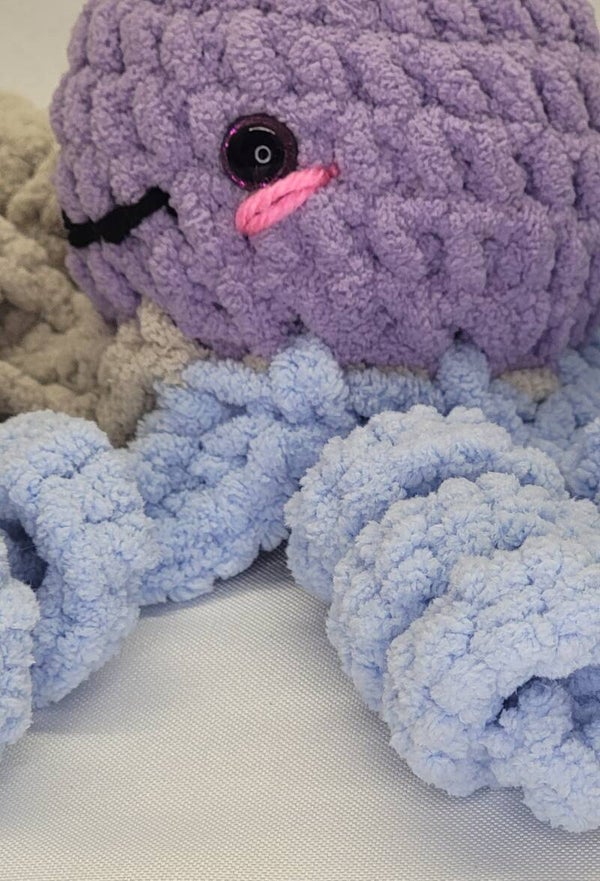 11" long Baby blue lilac and tan jellyfish with purple sparkly safety eyes and a big smile!