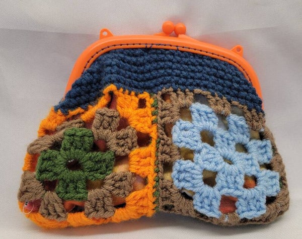 Orange handle clutch bag with Granny Squares and lined! 8" wide and 6" tall