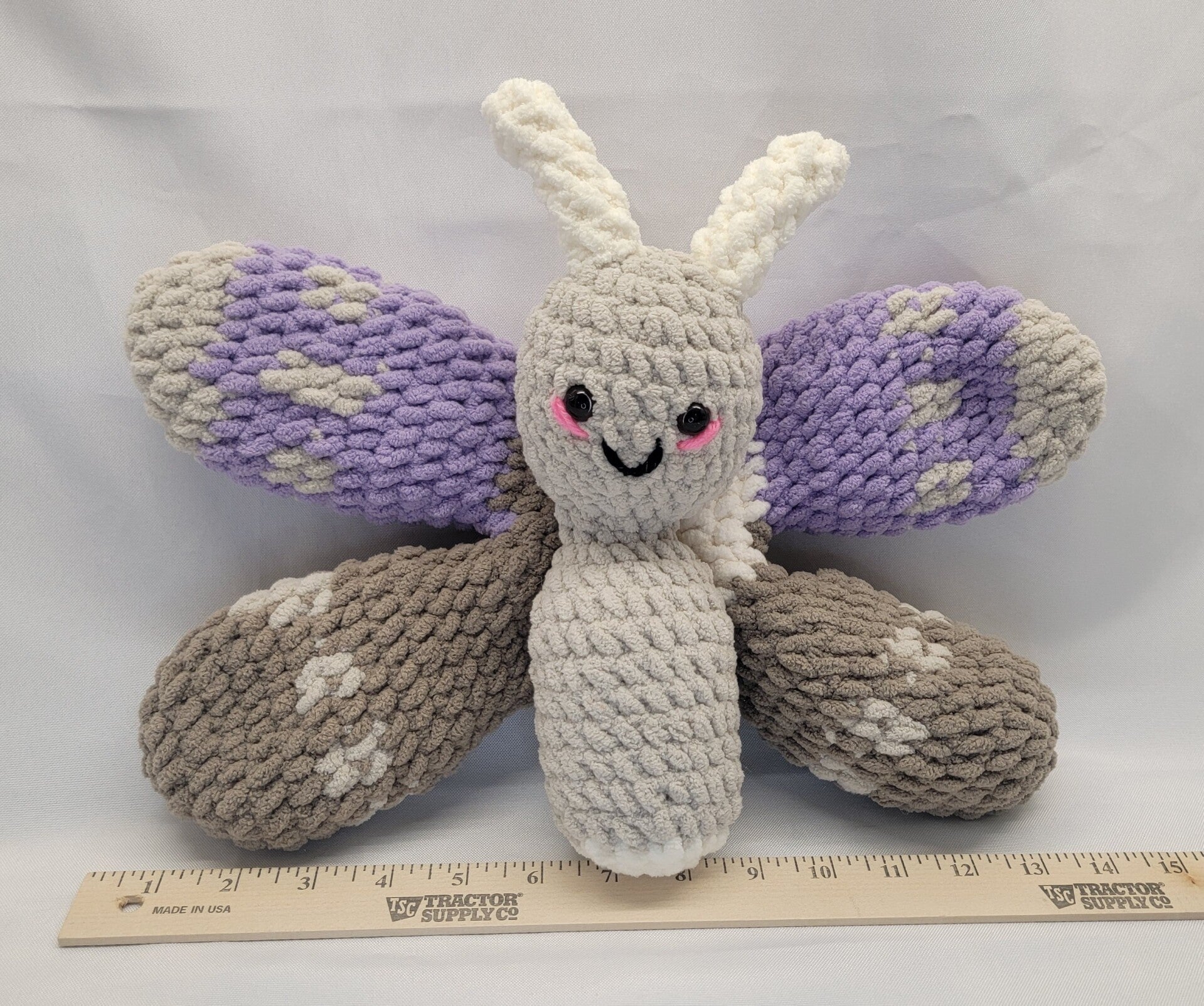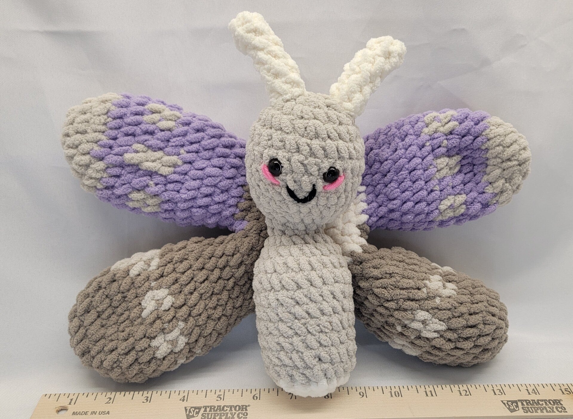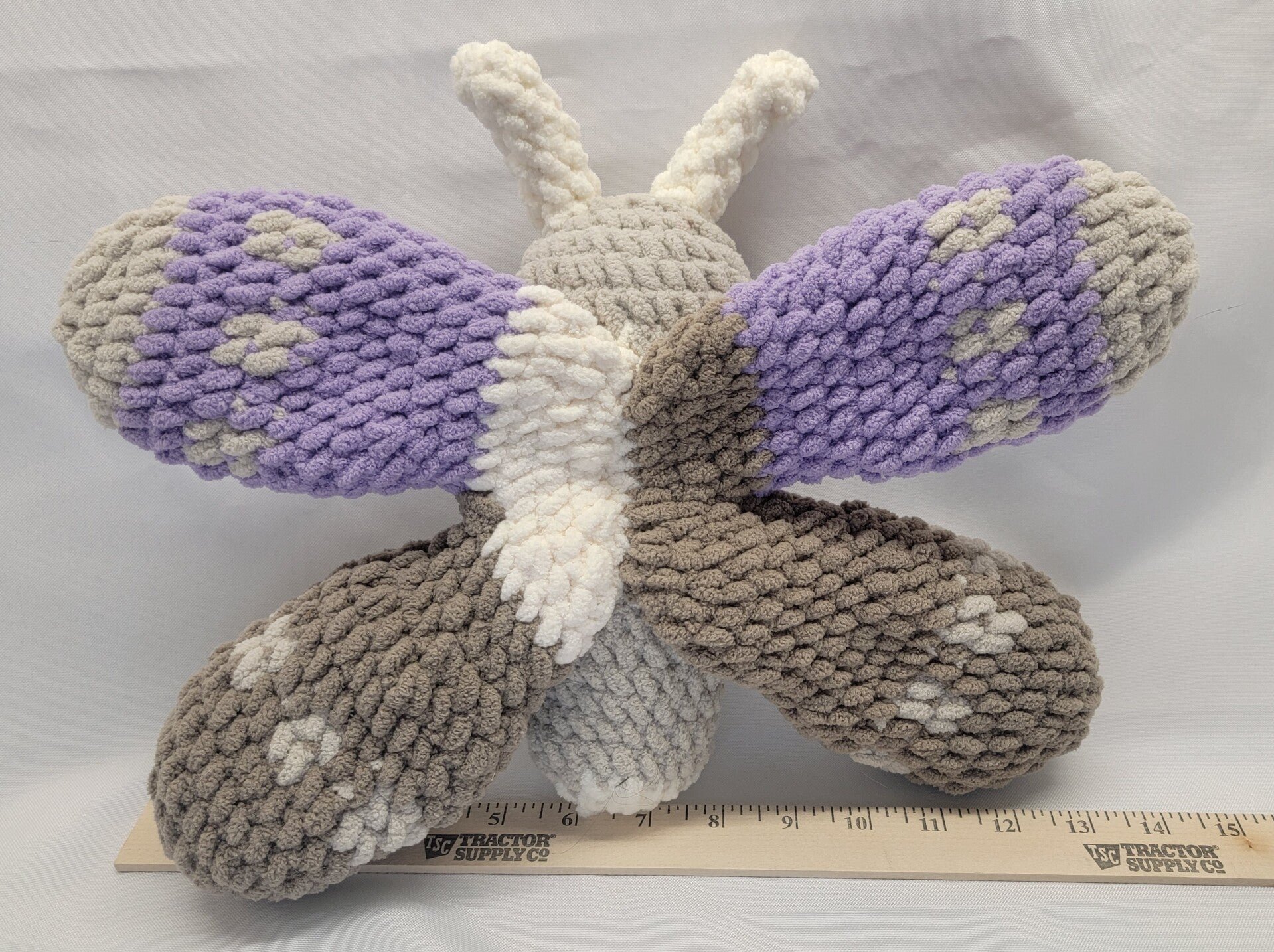 Soft and squishy Butterfly in plush yarn in lilac beige and tan. Black Safety eyes and a big smile. 14" wide and 11" tall.