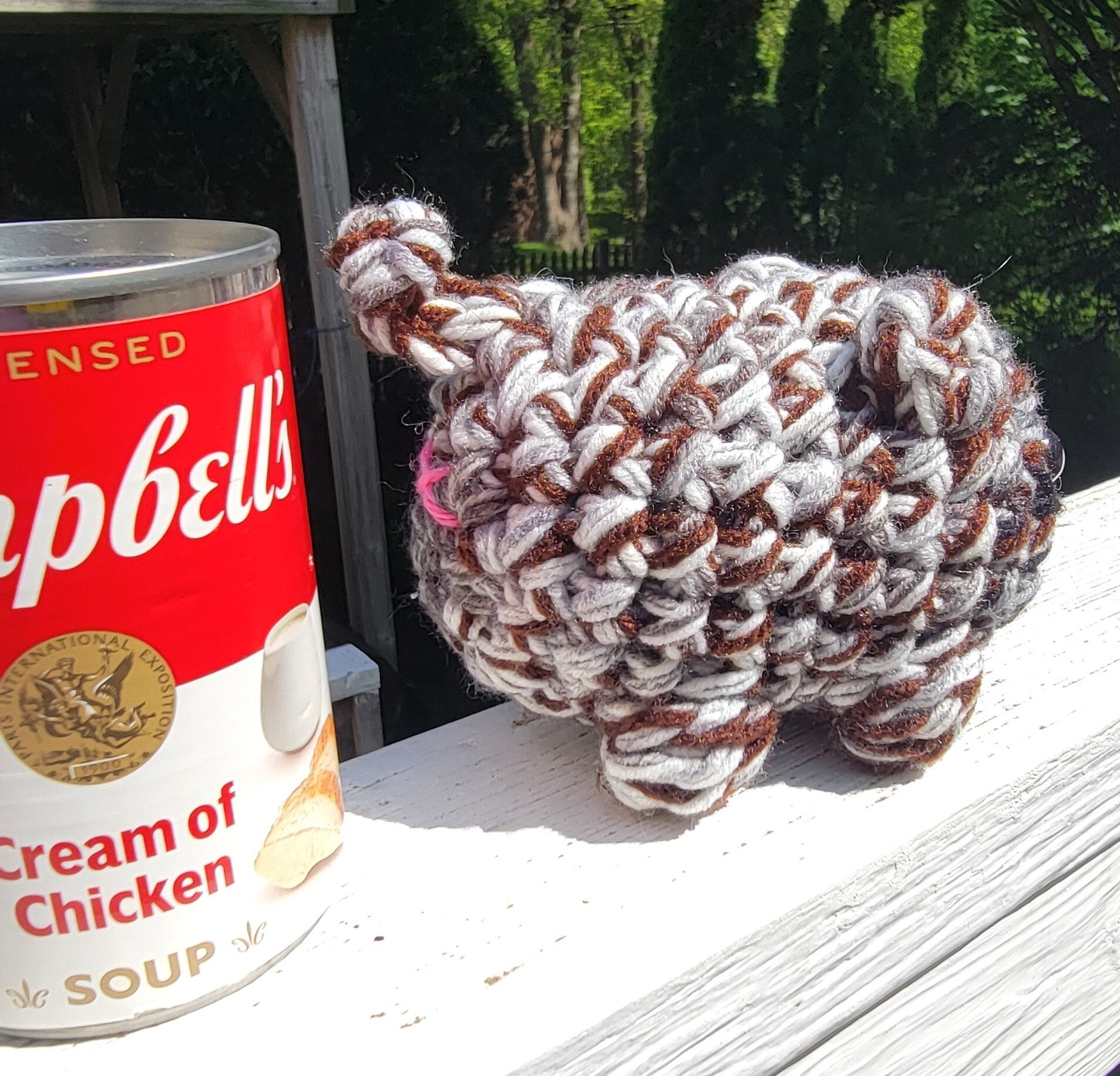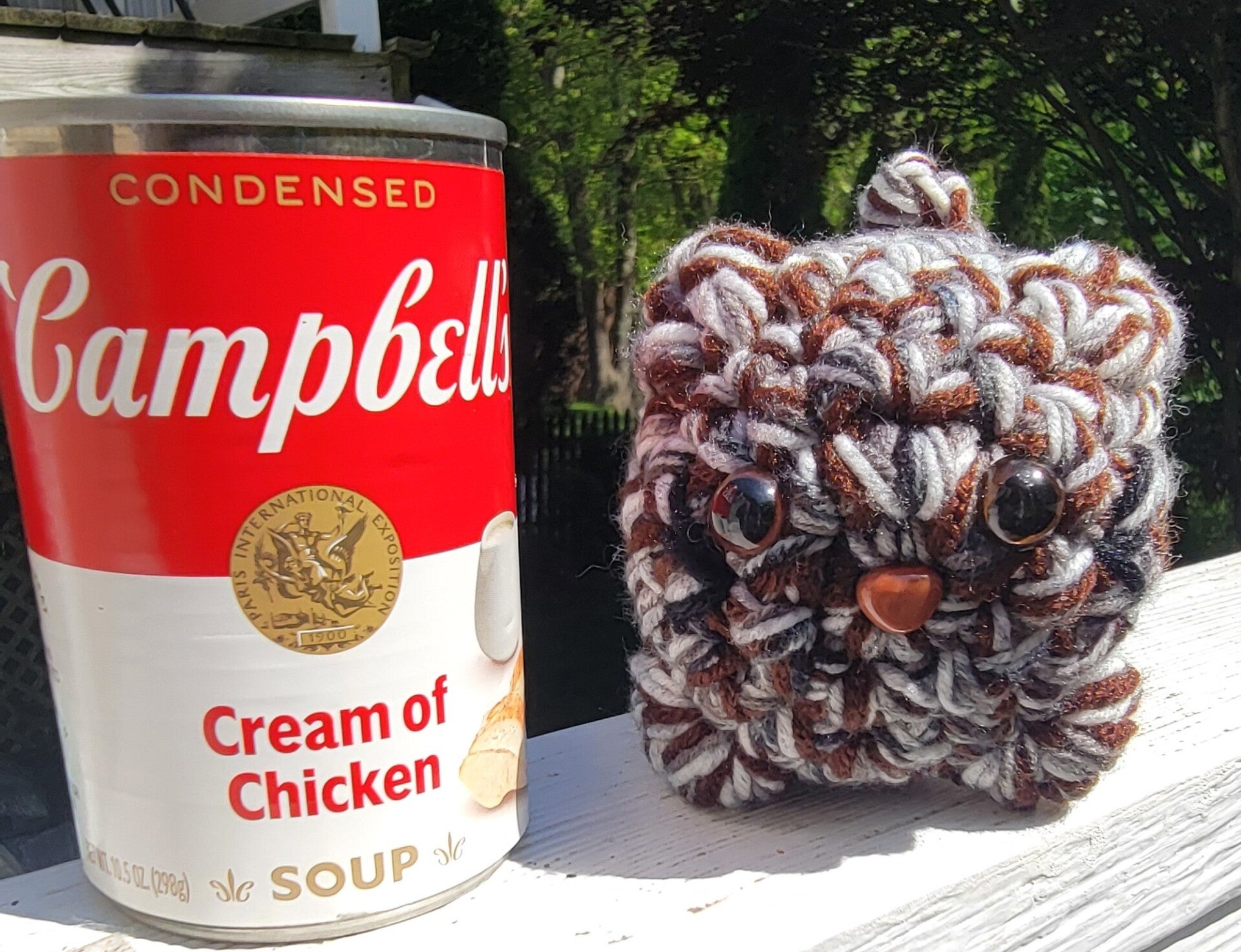 Brown grey and white cat with brown safety eyes and a brown nose. 5" long and 5" tall.