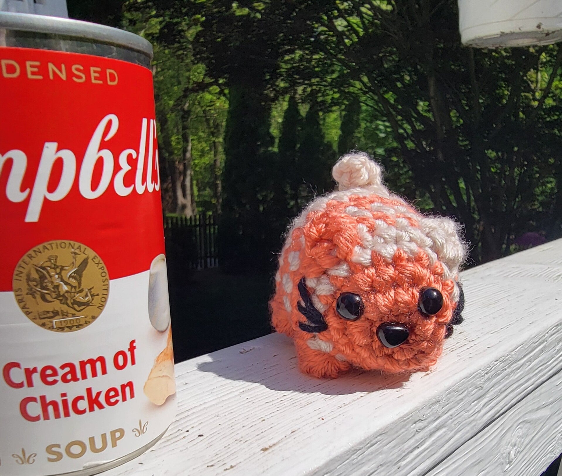 Small 3" long and 3" tall cat. Beige and orange yarn with black safety eyes and a nose.