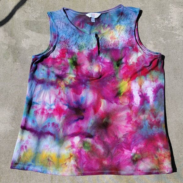 Liz Sport rayon tank top with lace insert at neck with 2 buttons. Dyed to resemble water flowers by placing shirt on top of plastic cups and allowing dye to drop down the side. Dyed in Leaf Green lilac sun yellow cotton candy and Golden Pineapple