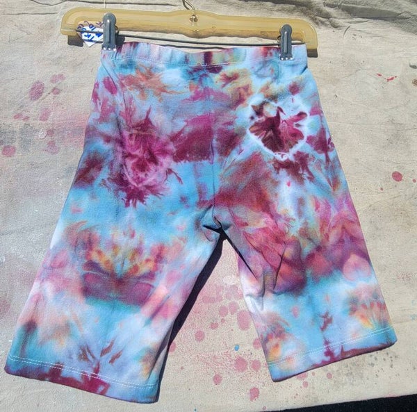 Cotton and spandex bike shorts dyed in Strawberry Skies with 4 hearts. Elastic waist