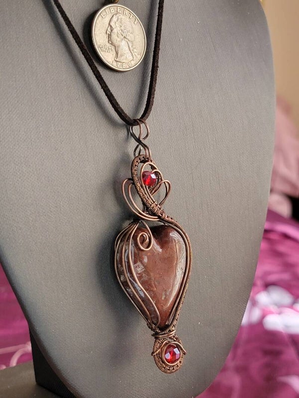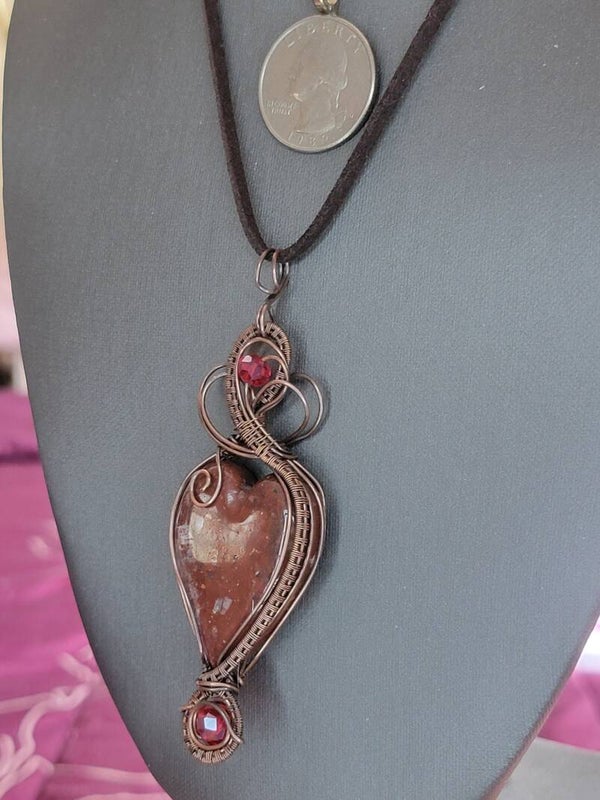 Pendant & Necklace Heart Cabochon, Red Jasper w/2-zircon crystals. Copper wire wrapped.