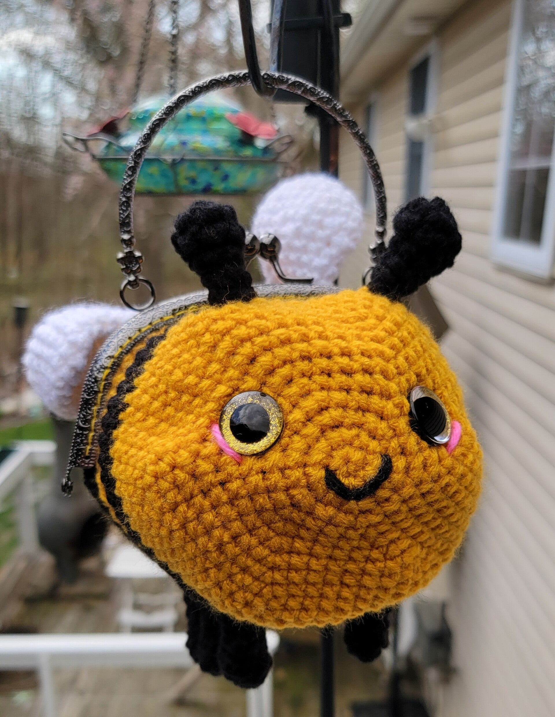 Bee handbag with a metal clasp in the middle of the bag. Lined in, what else, flower patterned material. Gold sparkly safety eyes and a big smile! He's bee-tastic! 11" long including his stinger and 17" circumference