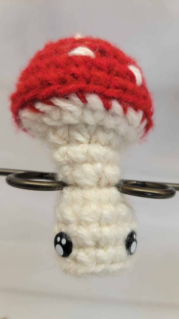 Popping Mushroom cap! Red and cream colored with black cartoon safety eyes. 4" tall and pops to 6" tall