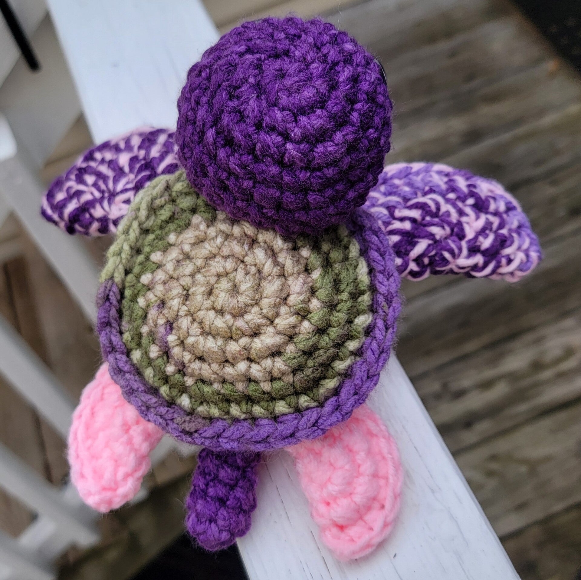 Purple and pink smiling turtle. 8" long. Pink and purple dragon eyes and a smile!