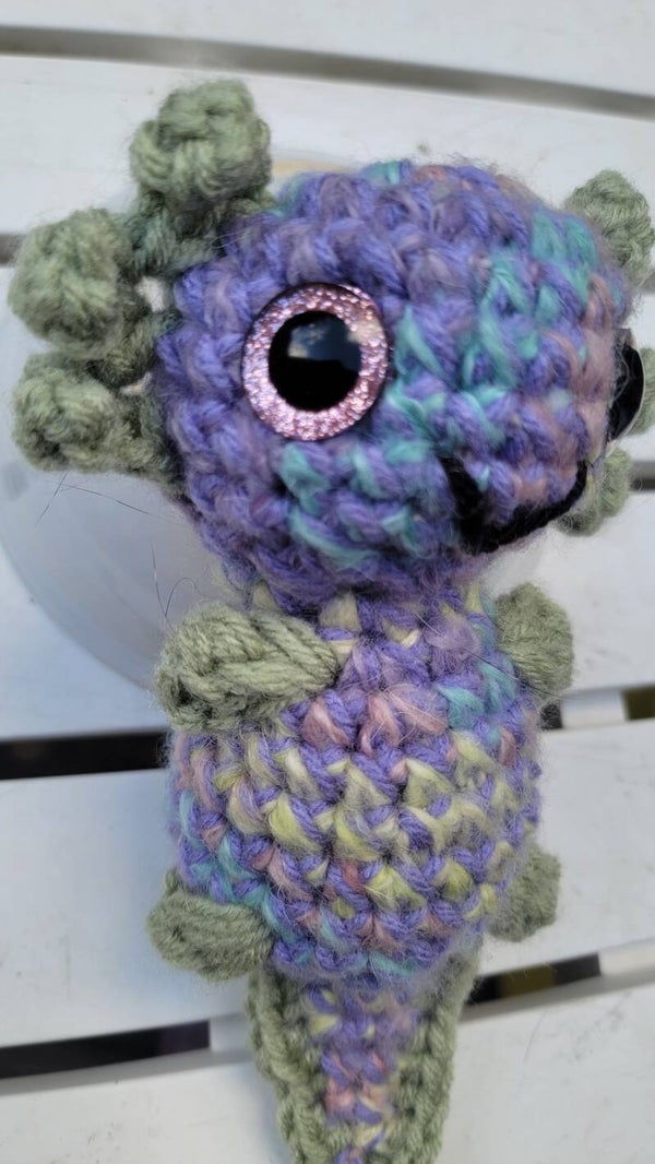 9" long Purple lilac green and yellow Axoloti with pink sparkly safety eyes and a big smile