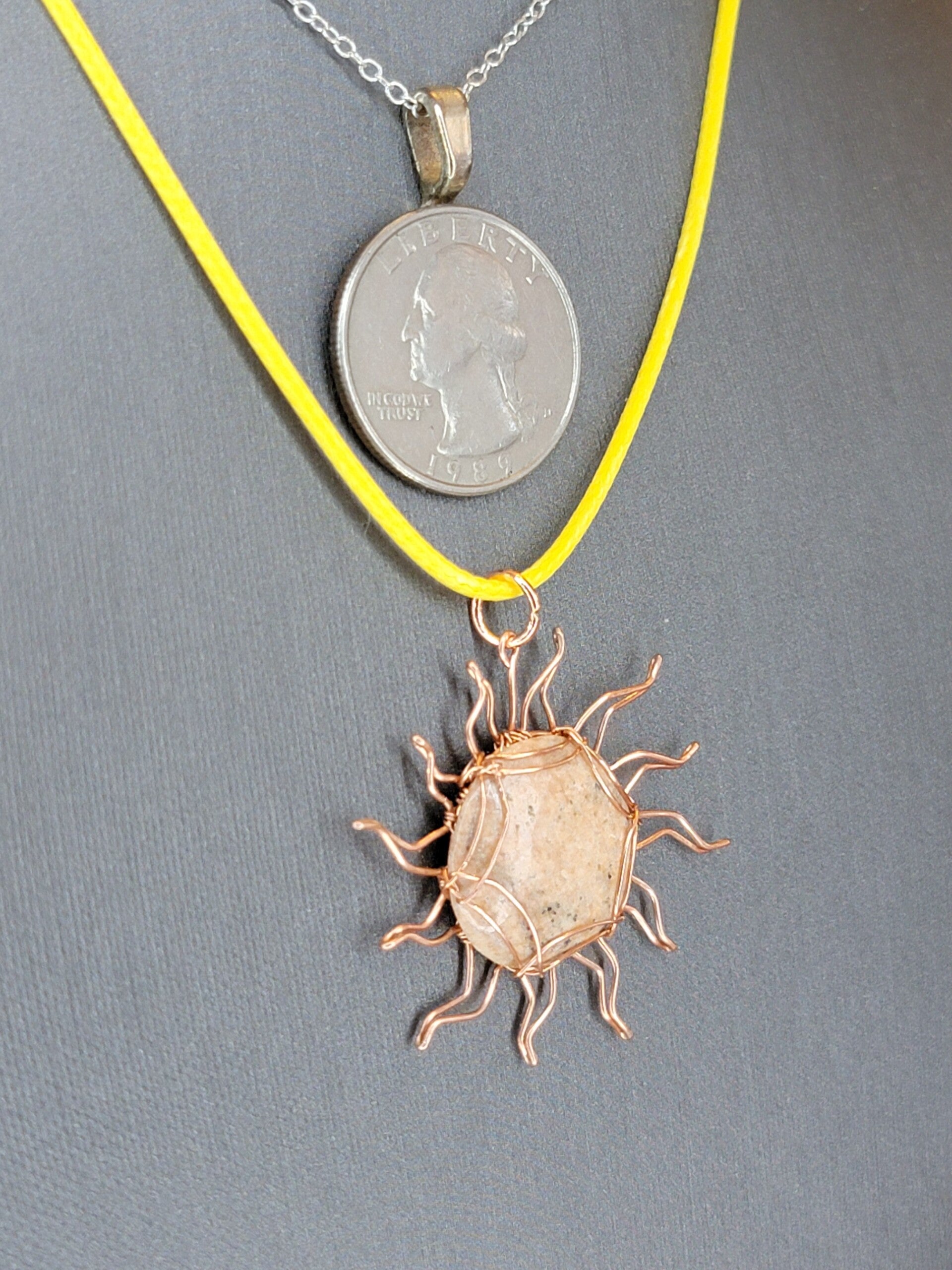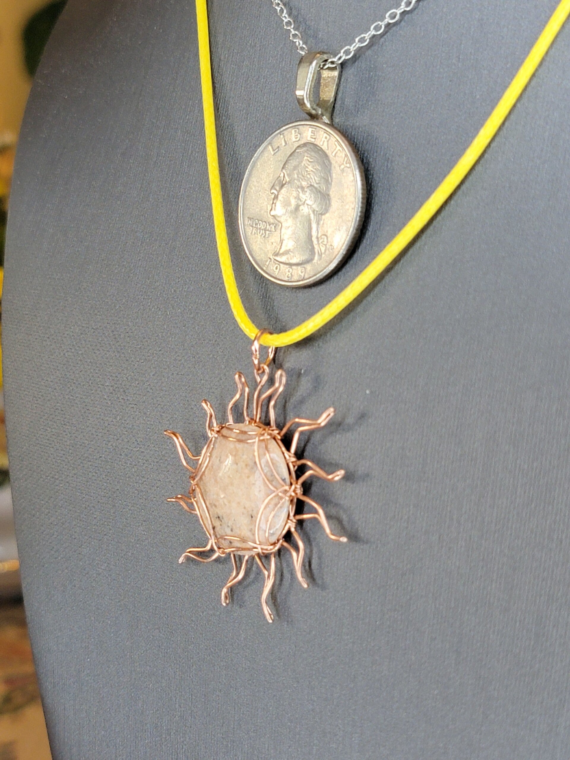 Pendant & Necklace, Rhodonite Sun Cabochon, wrapped in copper.