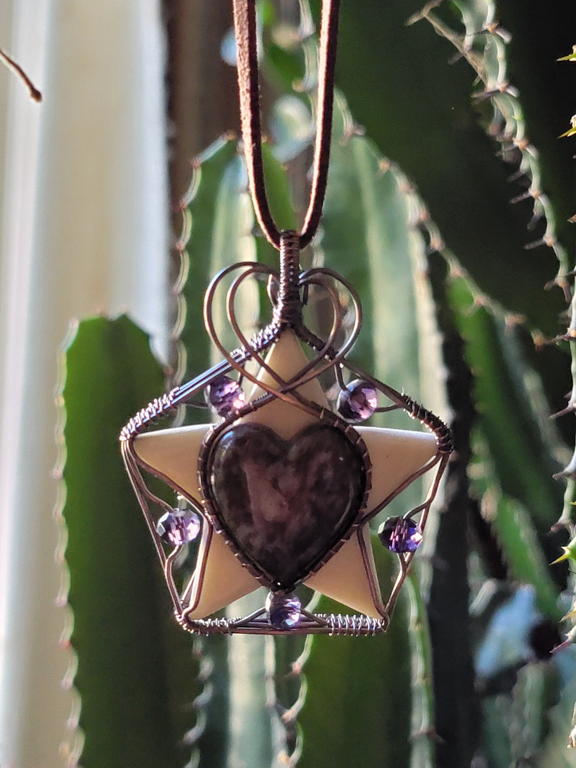 Pendant & Necklace Pentagram, White Jasper Star and Brecciated Jasper Heart, Wrapped in copper.