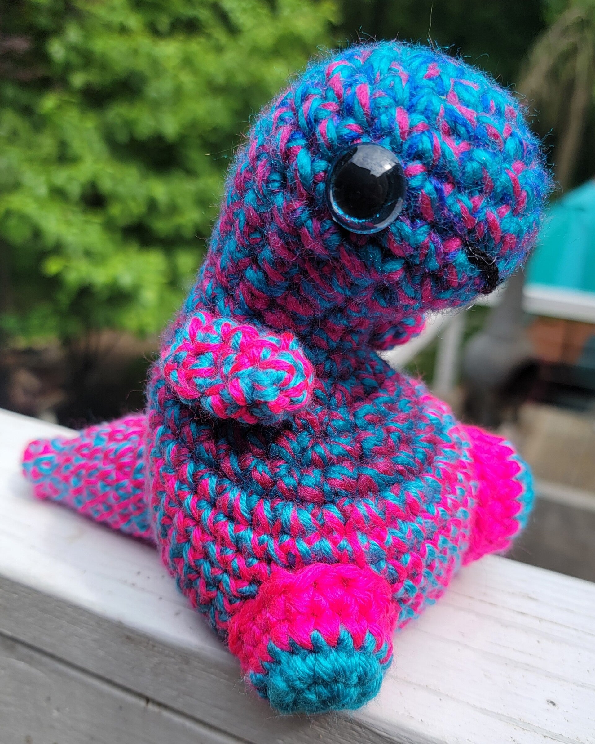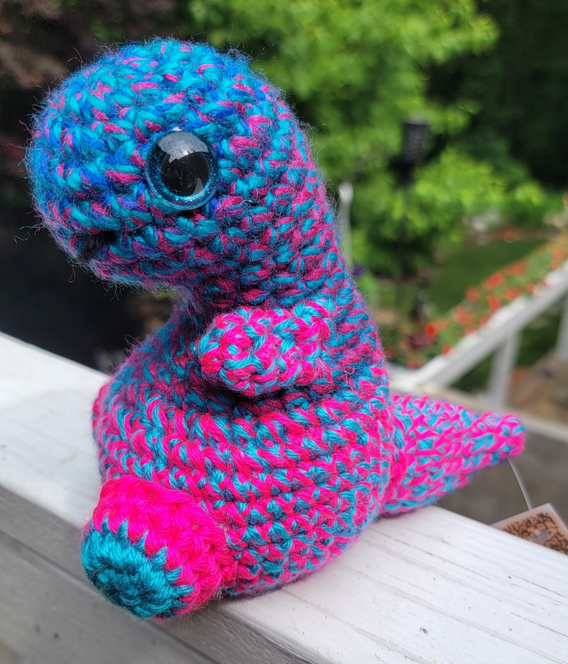 Shades of Bright blue and Hot Pink! Blue sparkly safety eyes. 7.5" tall and 7" long