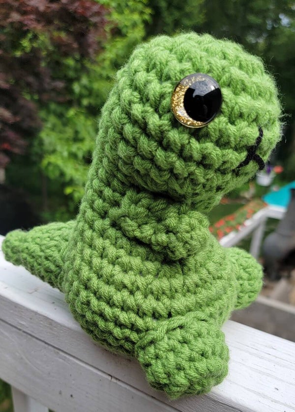 Green T-Rex with HUGE Gold sparkly safety eyes. 9.5" tall and 9" long