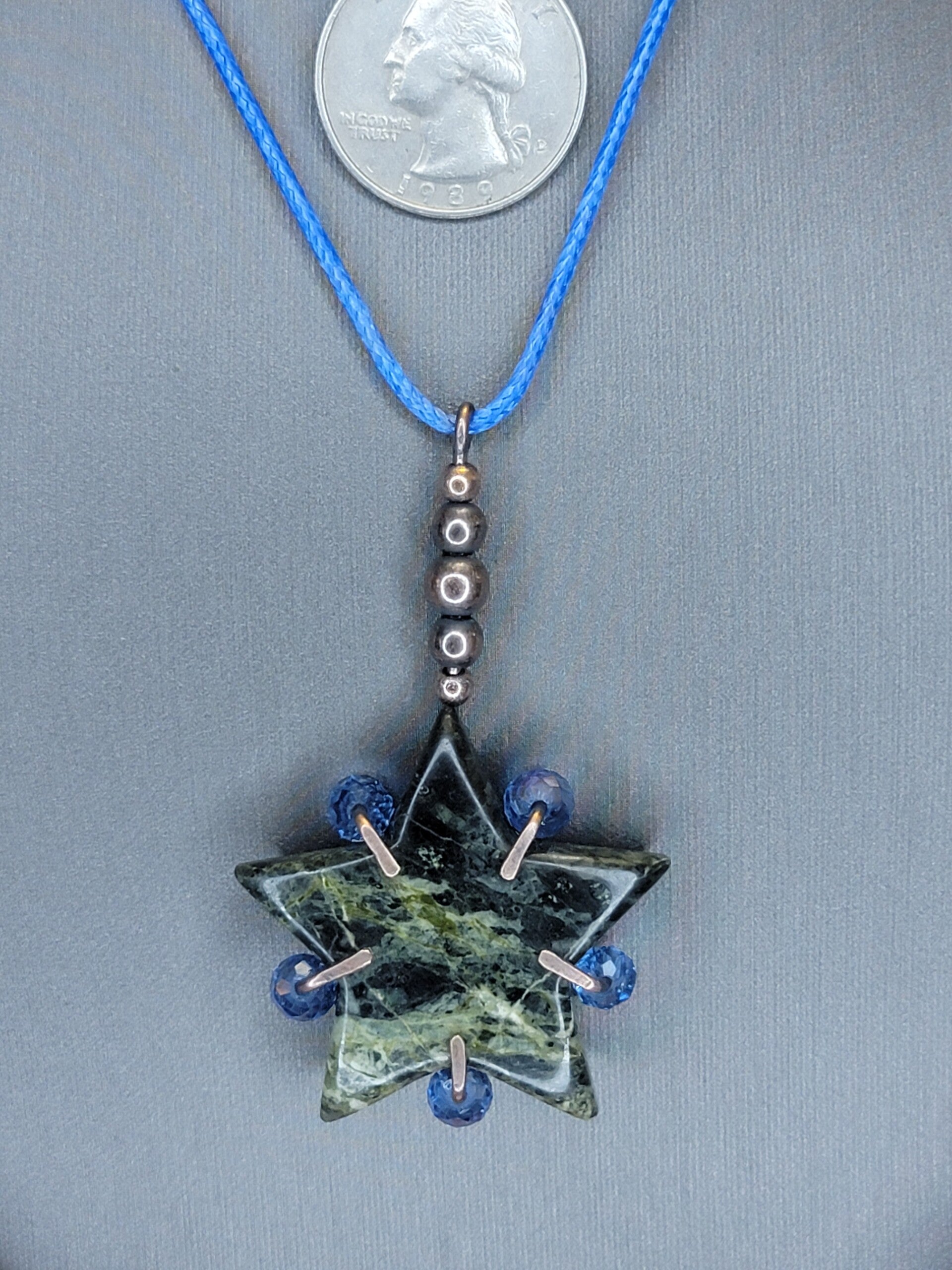 Pendant & Necklace Serpentine Jade in a Star shaped cabochon. w zircon beads. Wire wrapped in copper.
