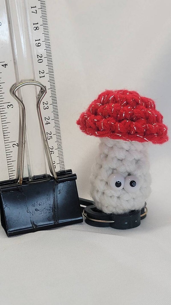 White stemmed mushroom with a red and silver cap. 3.5" tall. Googly safety eyes