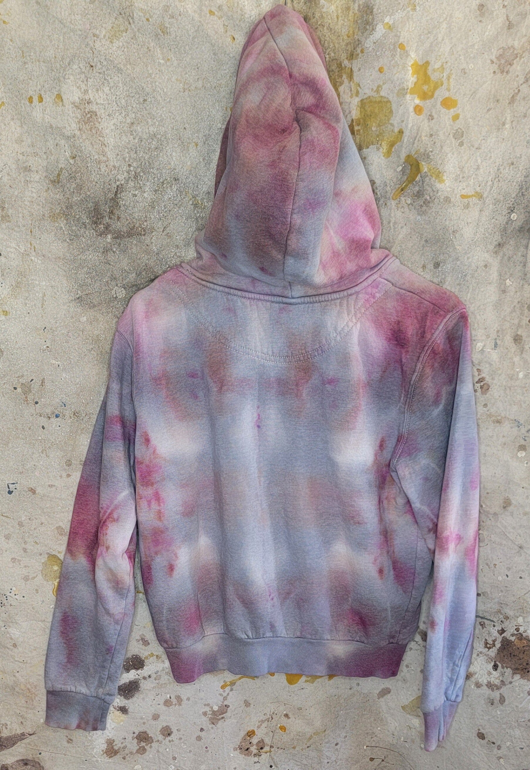 Heavyweight hooded zippered long sleeved sweatshirt dyed in muted colors of blue grey rose.