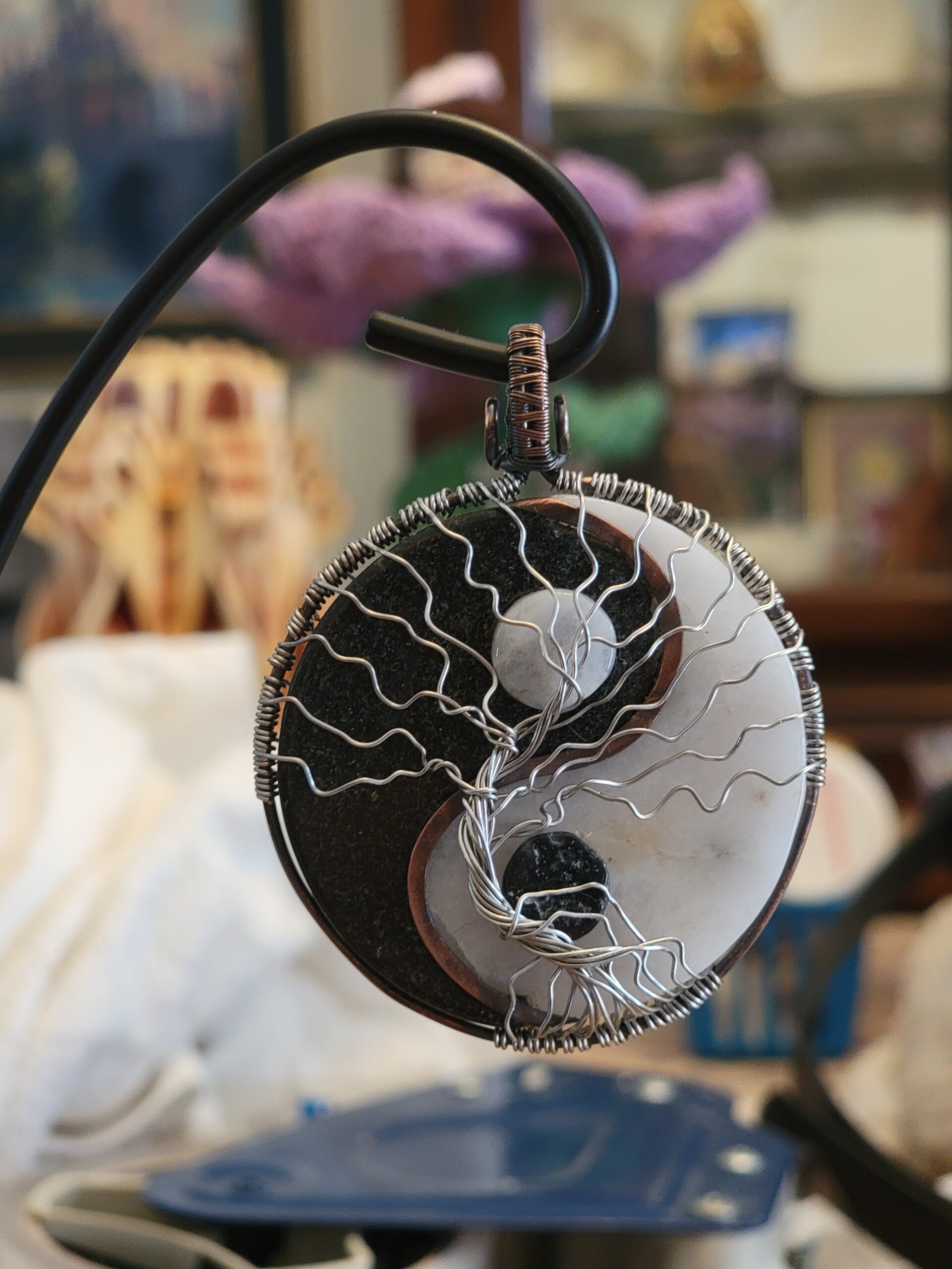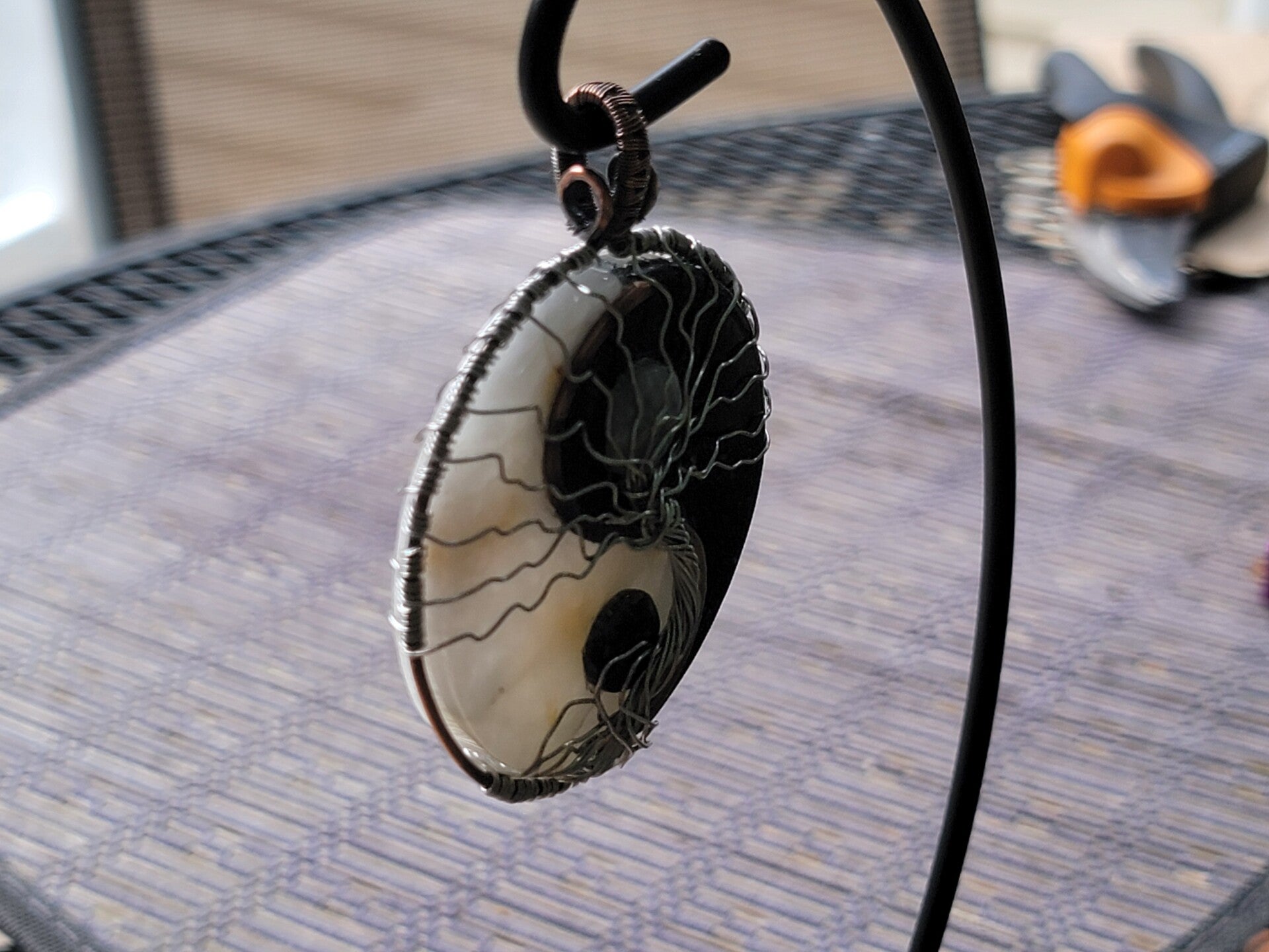 Pendant, Necklace, and table top art. Yin-Yang with two trees of life.