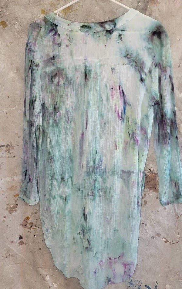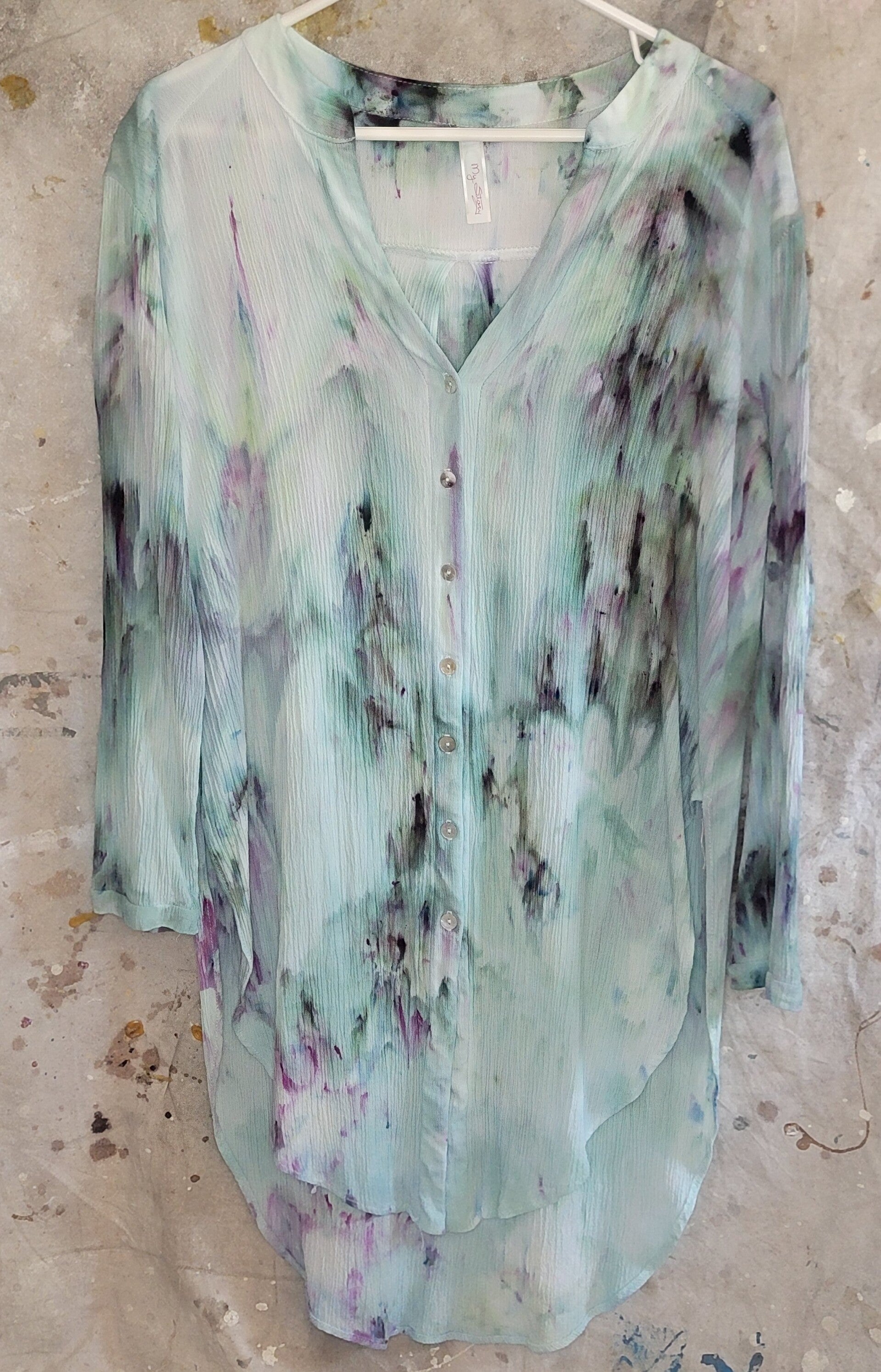 My Story brand rayon gauze-like long sleeved v-neck shirt with buttons. Lightly dyed in Moonstone