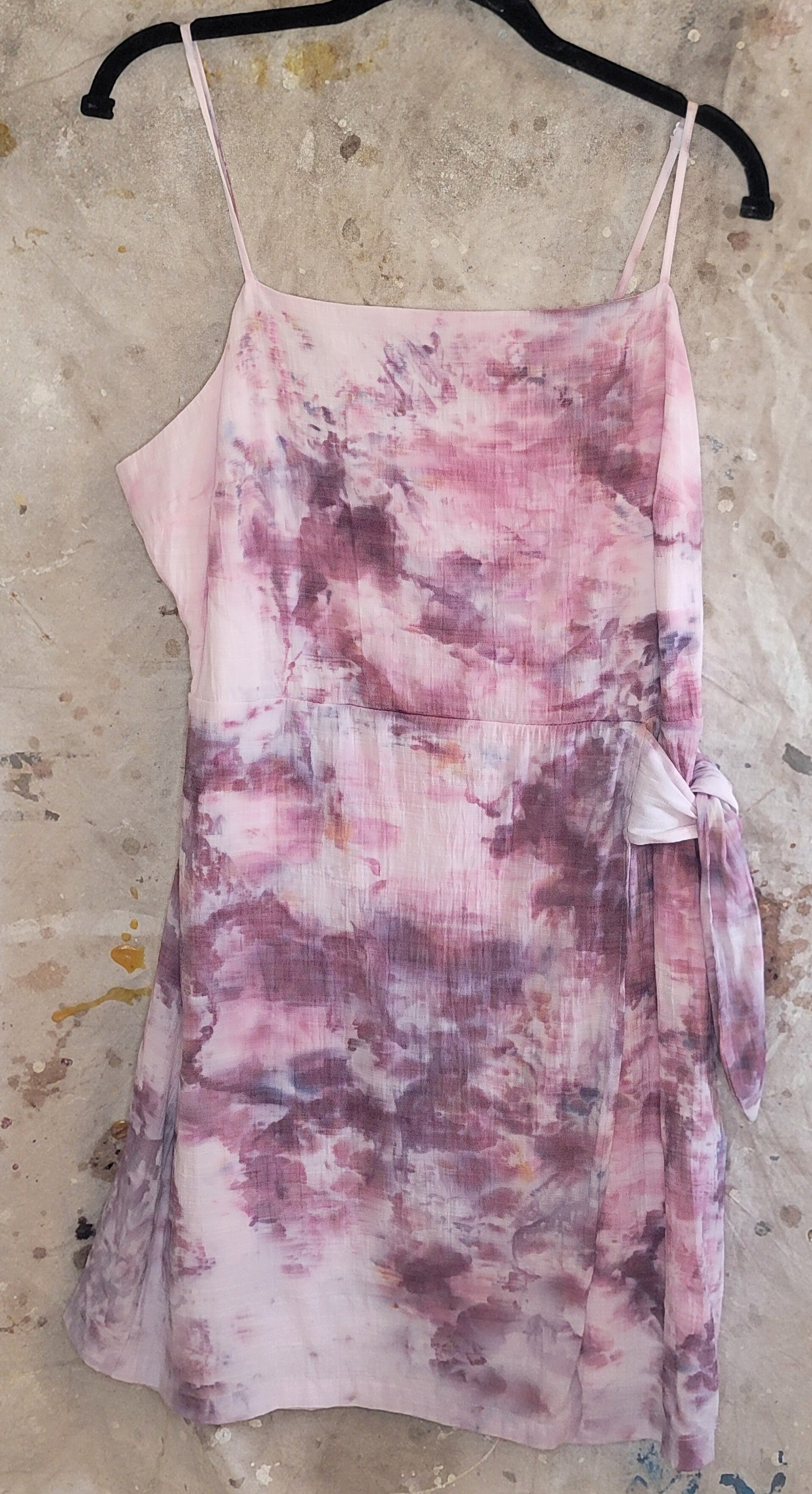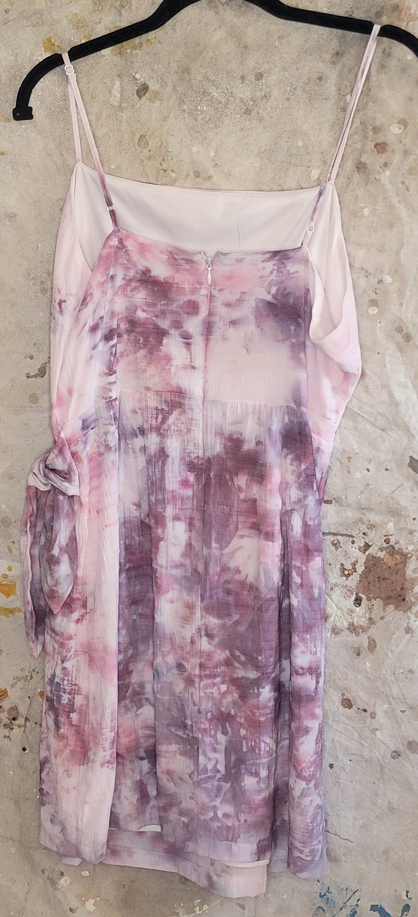 Nine West brand rayon and lined spaghetti strapped sundress dyed in Sachet. Zipper back and tie at waist