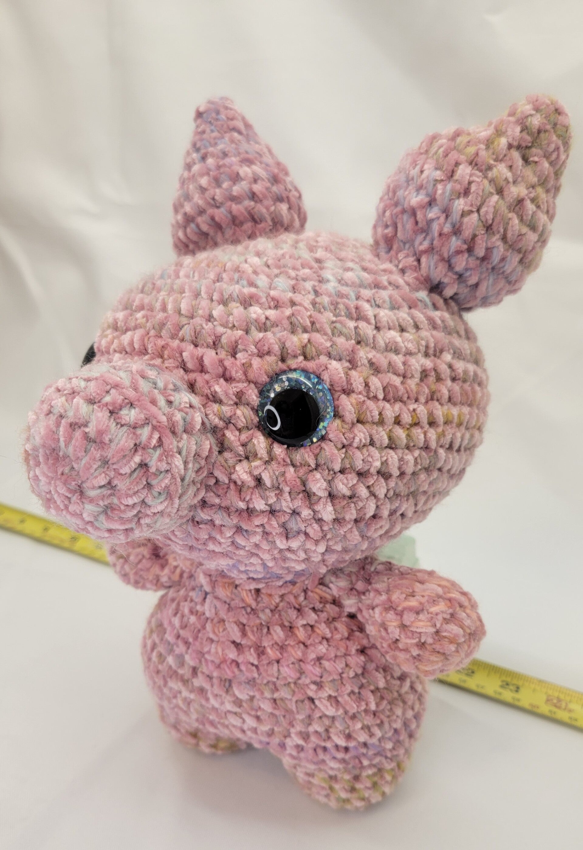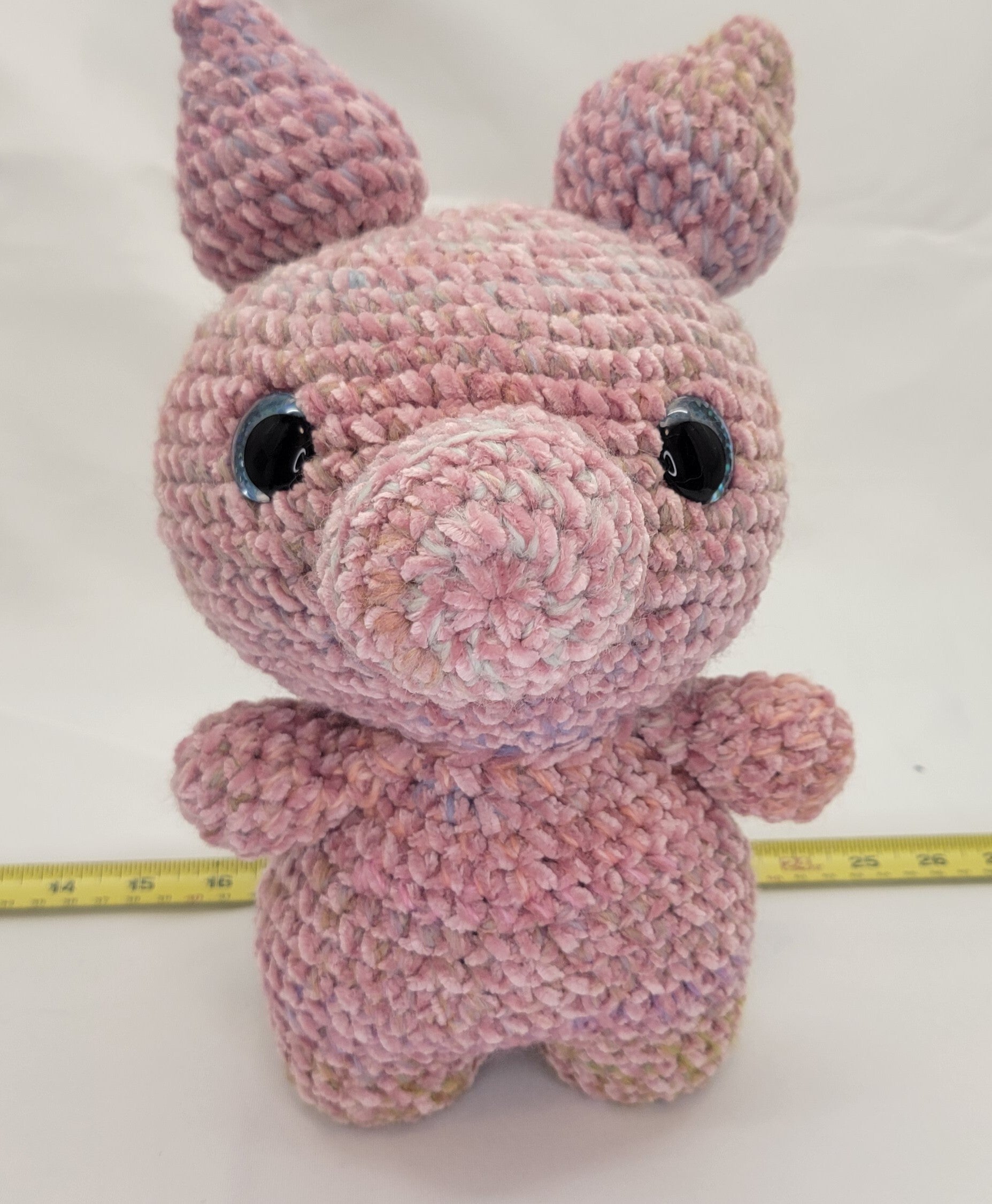 11" tall pink and white velvet yarn with blue sparkly safety eyes and a corkscrew tail