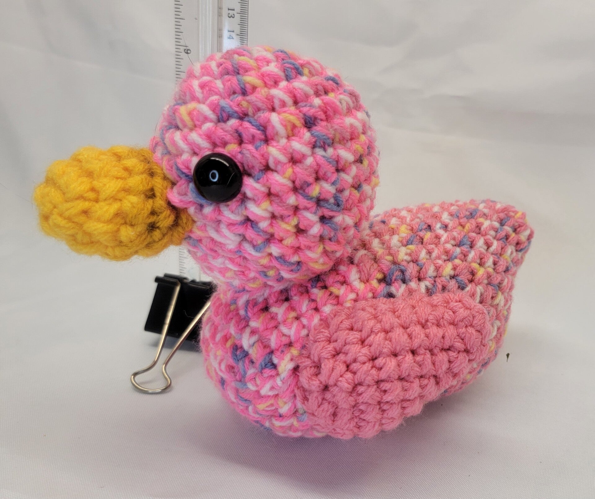 9" long and 7" tall pink white blue and yellow duck with black safety eyes and a yellow beak
