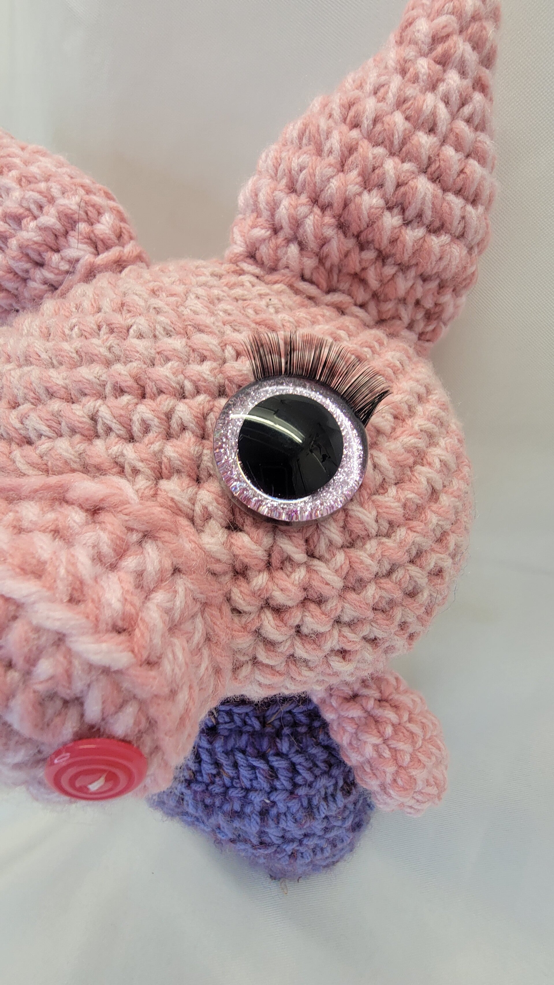 15"tall and 10" wide HUGE pink Pig in a Purple blanket. HUGE pink and purple sparkly safety eyes with EYELASHES and a corkscrew tail
