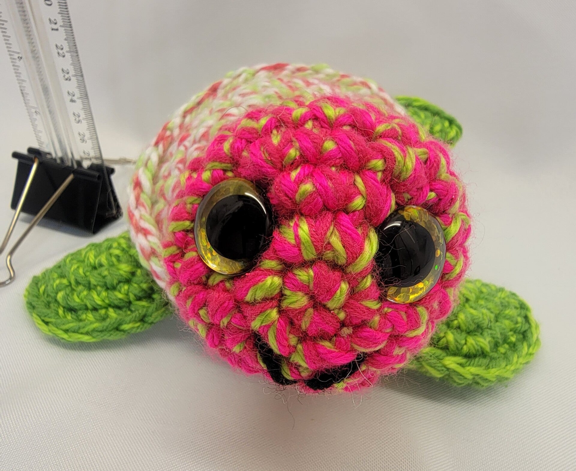 Large turtle in watermelon colors. Gold sparkly safety eyes. Large 9" long from tail to head and 9" wide from front fin to fin. Look at that smile!