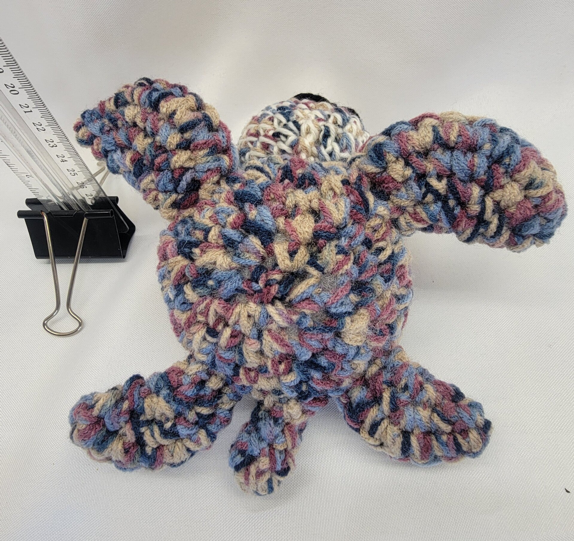 Large turtle in muted blues browns and beige colors. Blue sparkly safety eyes. Large 9" long from tail to head and 9" wide from front fin to fin. Look at that smile!