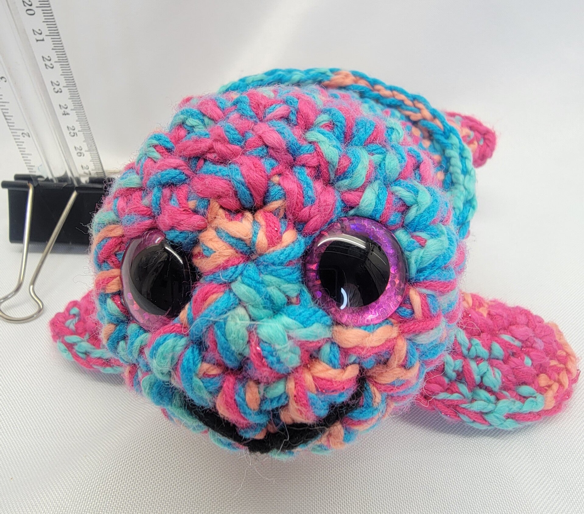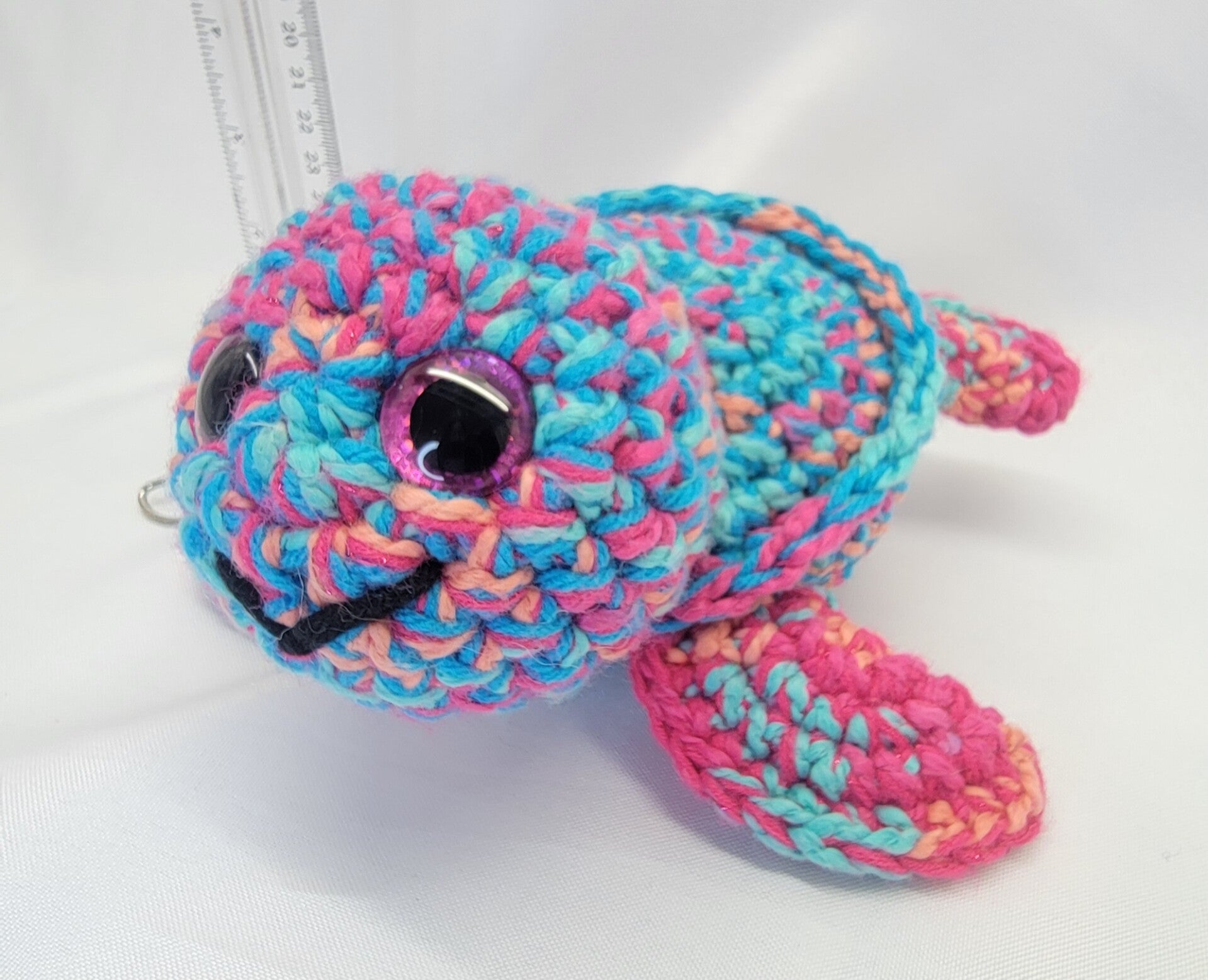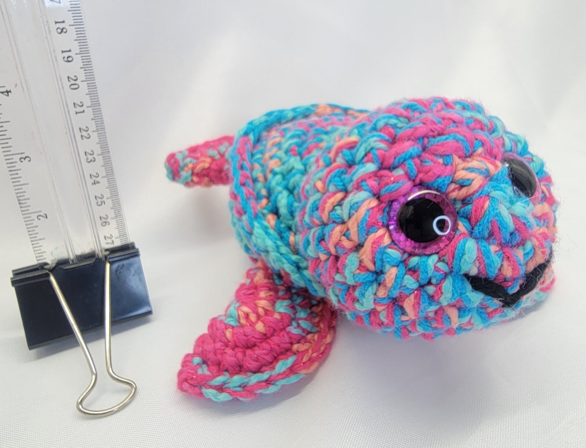Large turtle in bright teal orange and hot pink colors. Pink sparkly safety eyes. Large 9" long from tail to head and 9" wide from front fin to fin. Look at that smile!