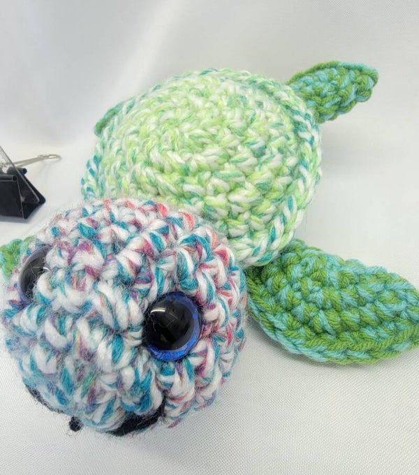 Large turtle in mint Green dark green blue and white colors. Blue sparkly safety eyes. Large 9" long from tail to head and 9" wide from front fin to fin. Look at that smile!