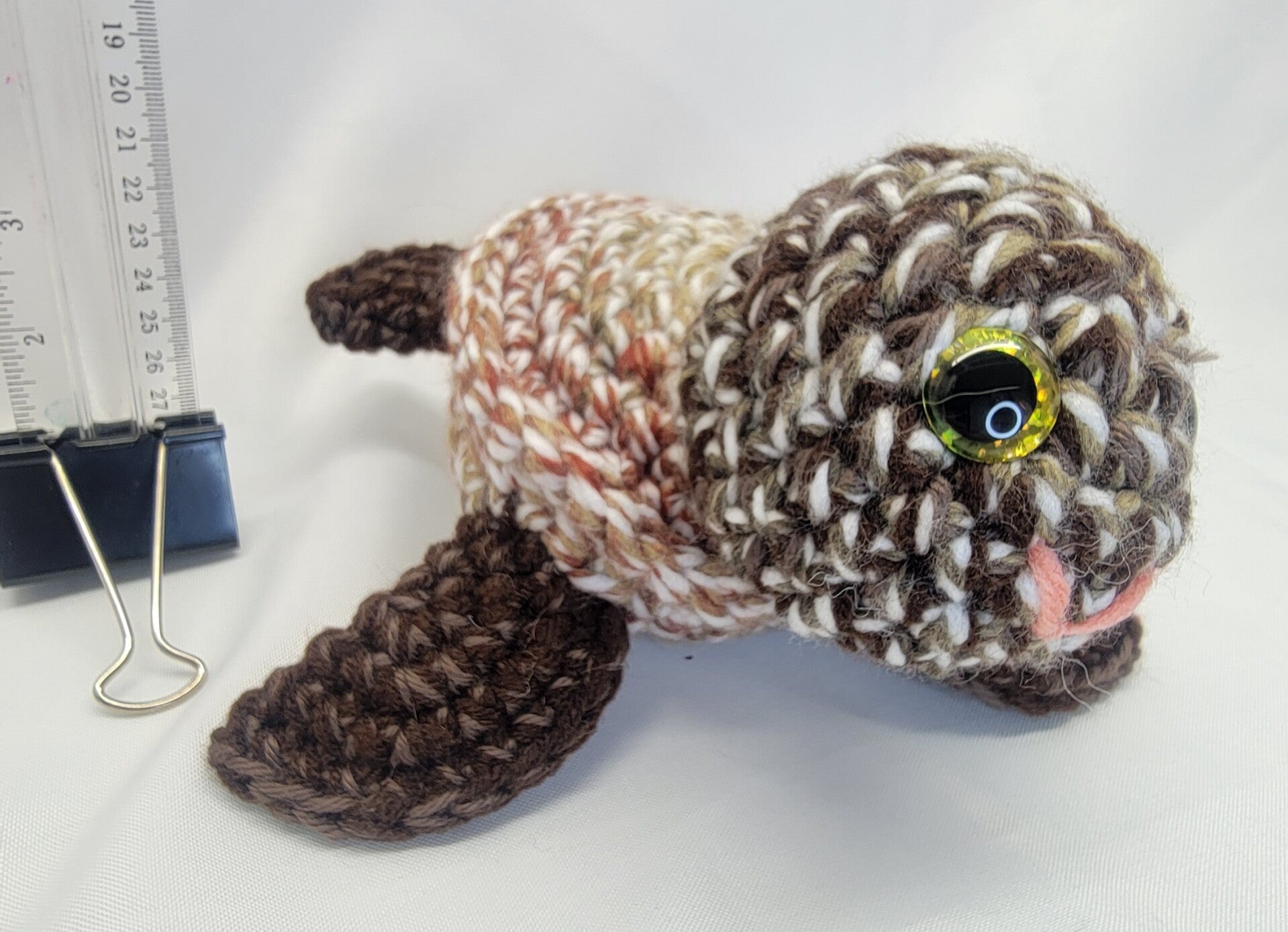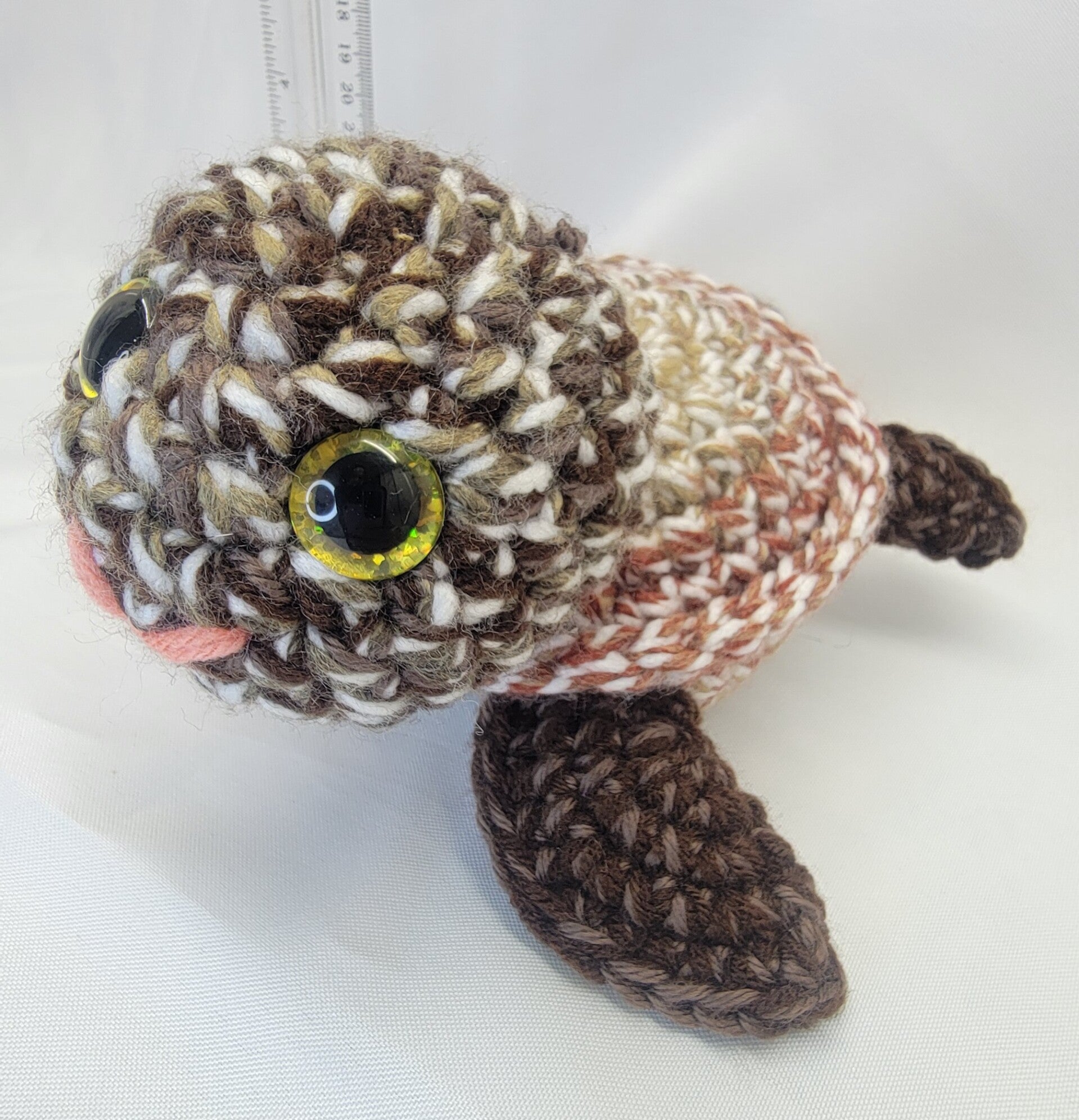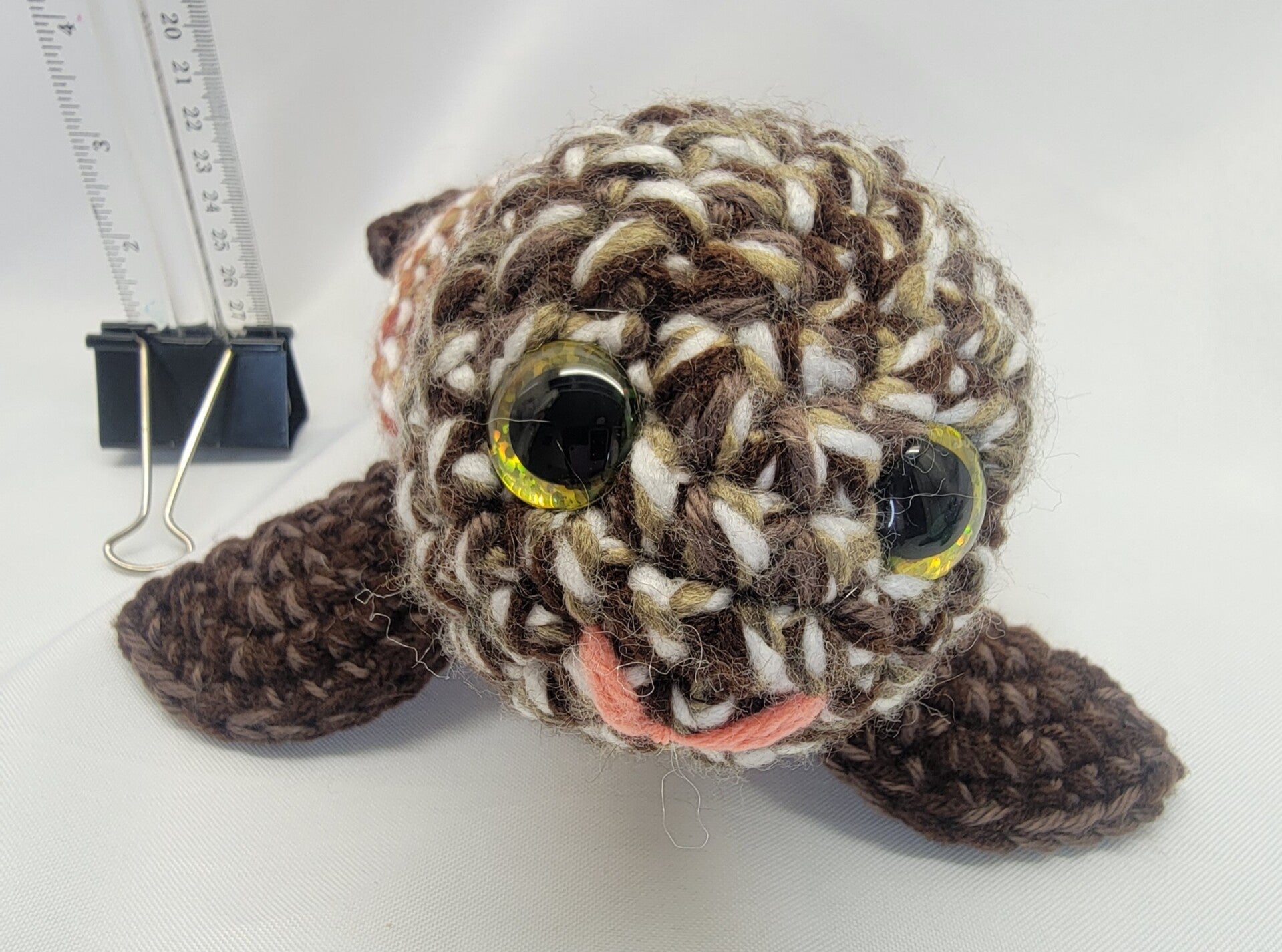 Large turtle in brown beige and light green colors. Gold sparkly safety eyes. Large 9" long from tail to head and 9" wide from front fin to fin. Look at that smile!