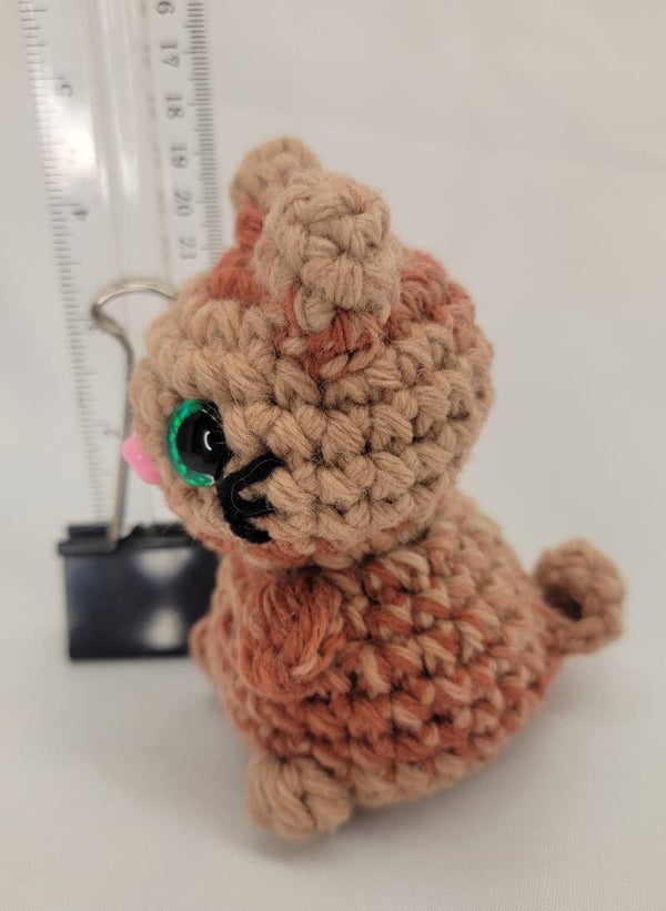 Brown and orange cat. 4.5" tall Big green sparkly safety eyes and a pink nose.