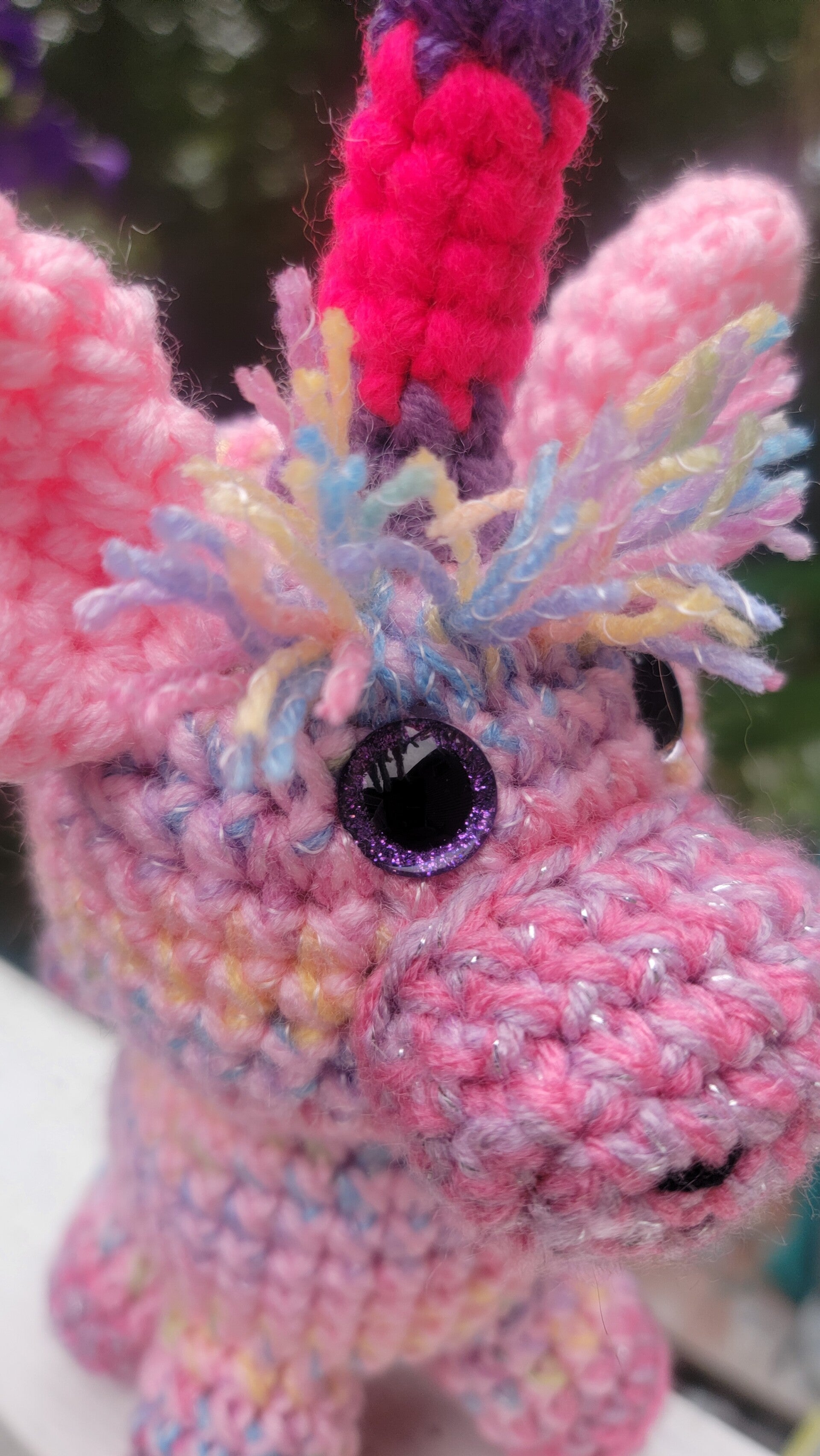 10" tall hot pink, pastel colors and white unicorn with light purple sparkly safety eyes horn and long hair with a tail