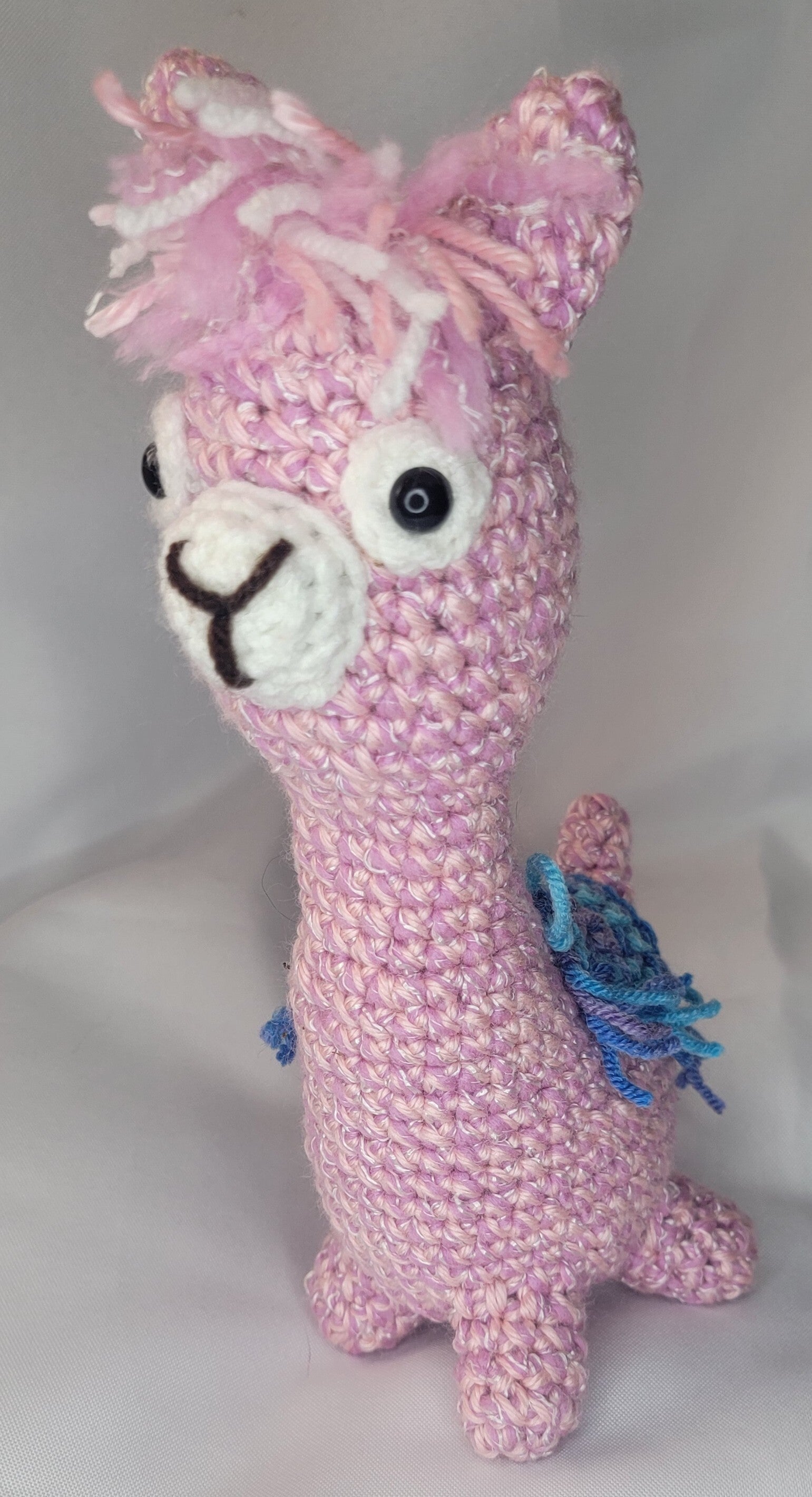 10" tall light pink and white long necked Llama with a blanket. Black safety eyes and a tail