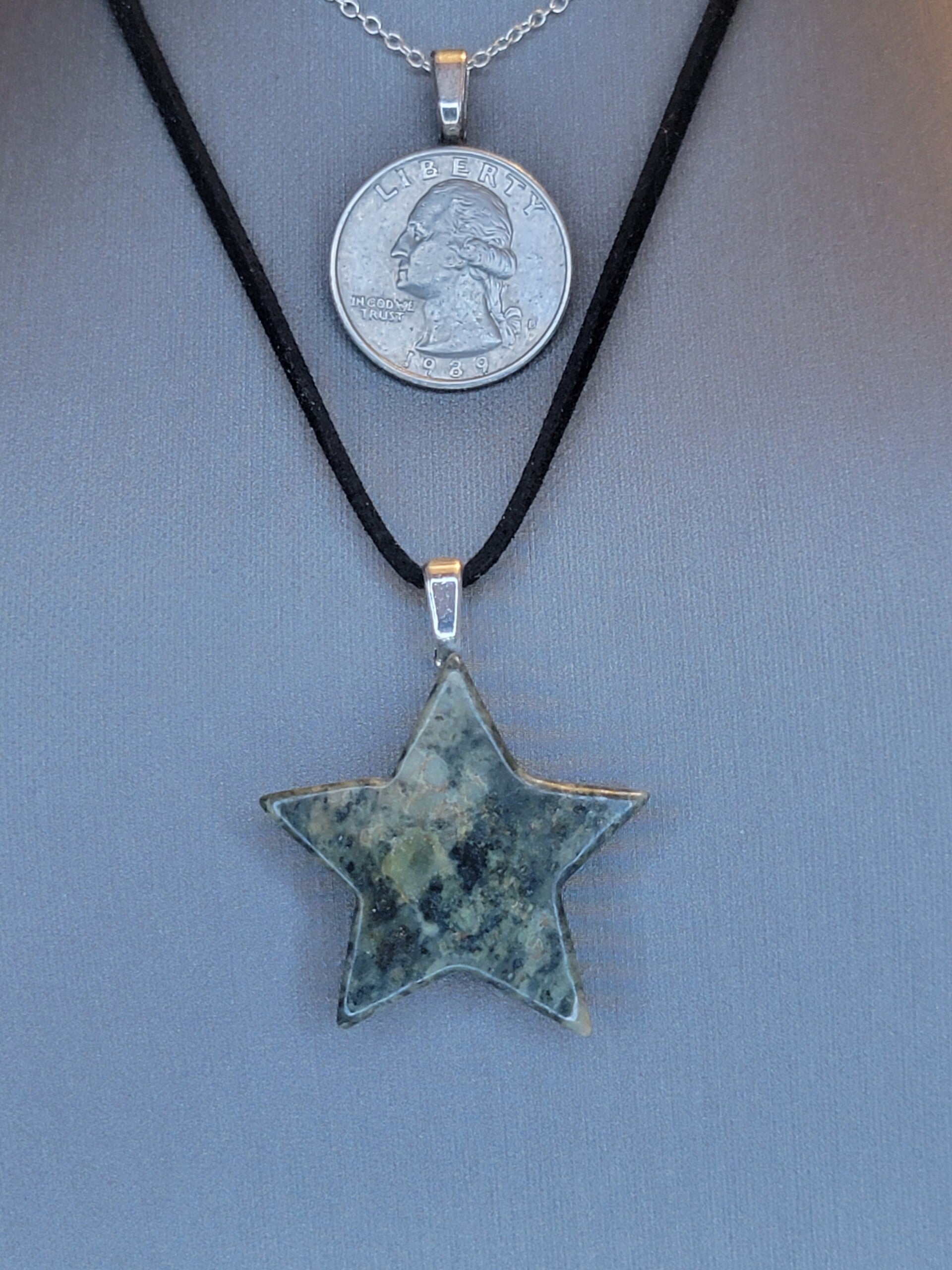 Pendant & Necklace Serpentine Jade in a Star shaped cabochon. w zircon beads. Wire wrapped in copper.