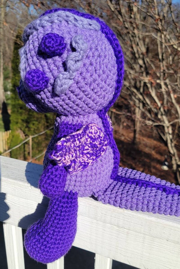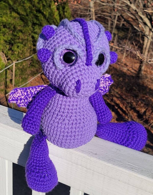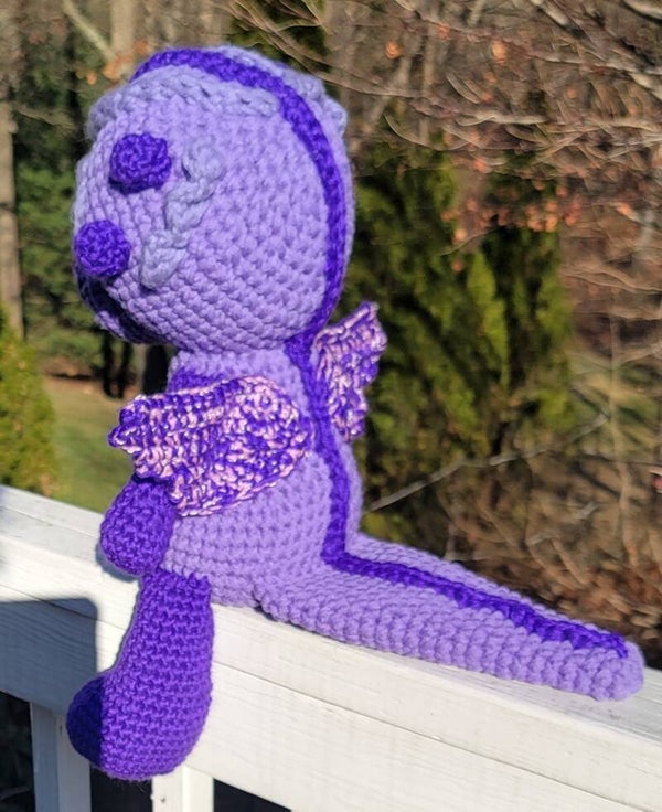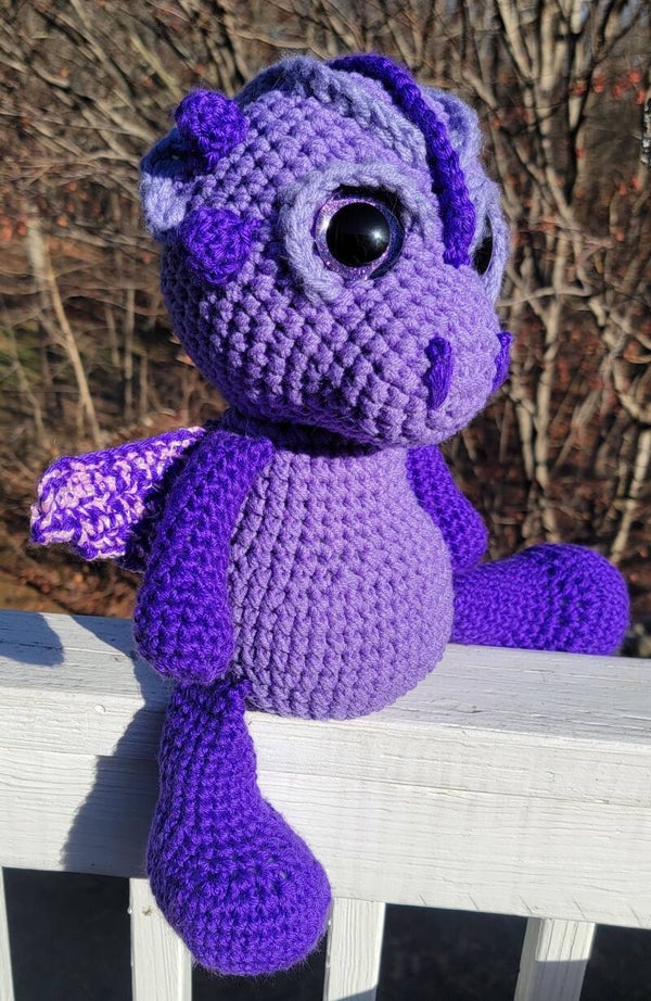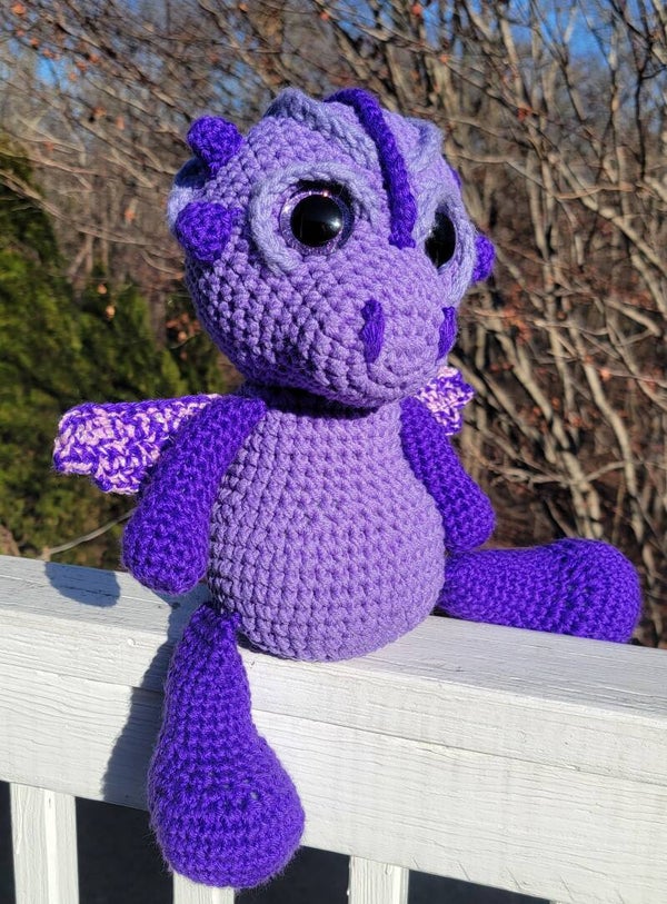 Shades of purple Dragon. Pink and purple wings. Purple sparkly safety eyes. 17" tall and 15" long. Long "spiked" tail
